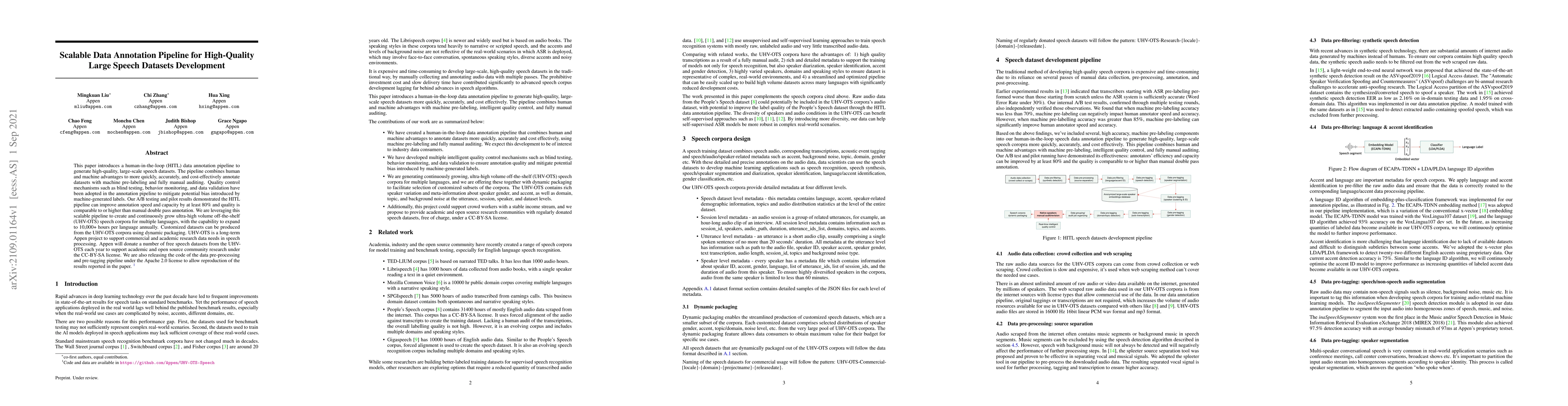 This paper presents a scalable human-in-the-loop data annotation pipeline that significantly enhances the speed and quality of large speech datasets, leveraging machine pre-labeling and human auditing. The pipeline supports the creation of ultra-high volume off-the-shelf corpora, with plans to donate free datasets annually to the academic and open source community.