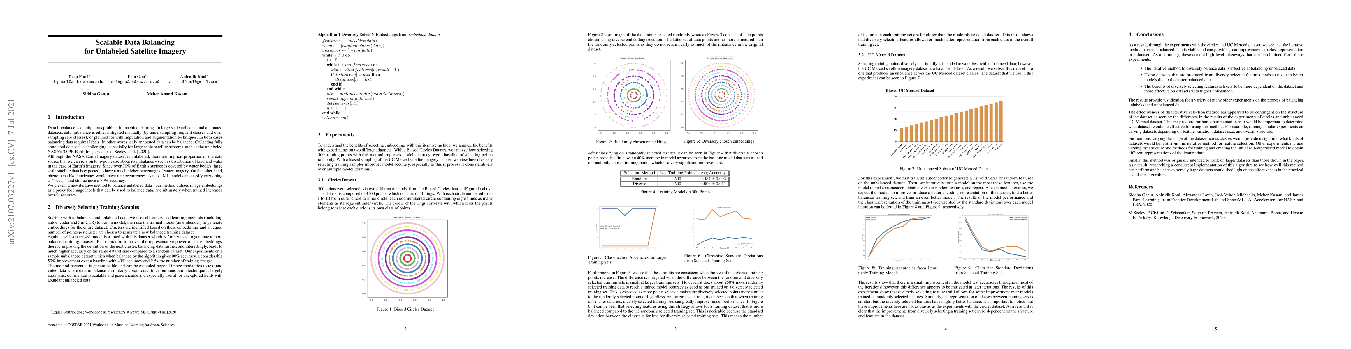 Data imbalance is a ubiquitous problem in machine learning. In large scale collected and annotated datasets, data imbalance is either mitigated manually by undersampling frequent classes and oversampling rare classes, or planned for with imputation and augmentation techniques. In both cases balancing data requires labels. In other words, only annotated data can be balanced. Collecting fully annotated datasets is challenging, especially for large scale satellite systems such as the unlabeled NASA's 35 PB Earth Imagery dataset. Although the NASA Earth Imagery dataset is unlabeled, there are implicit properties of the data source that we can rely on to hypothesize about its imbalance, such as distribution of land and water in the case of the Earth's imagery. We present a new iterative method to balance unlabeled data. Our method utilizes image embeddings as a proxy for image labels that can be used to balance data, and ultimately when trained increases overall accuracy.