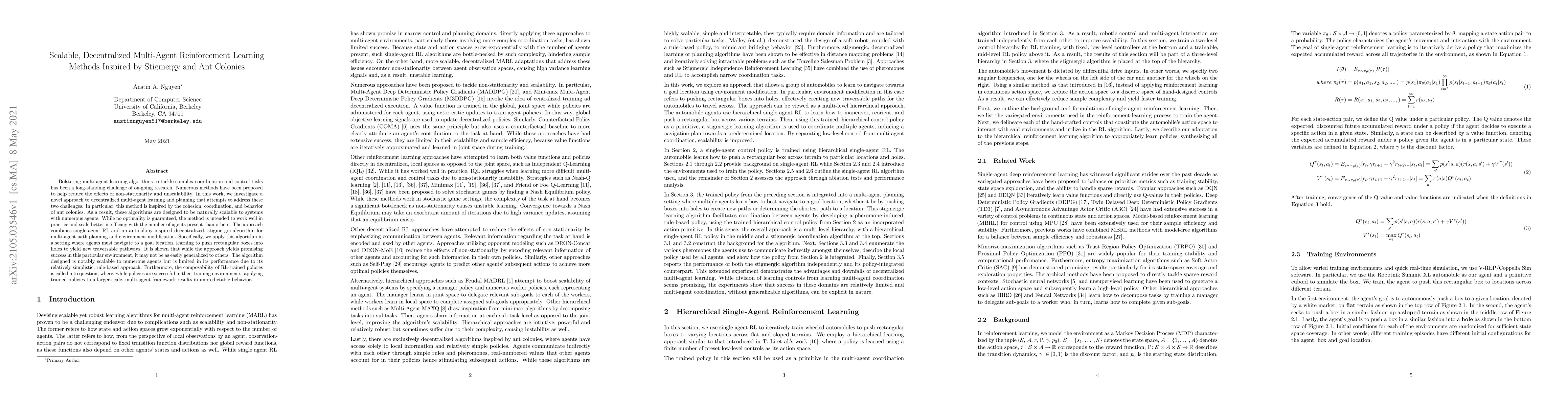 Bolstering multi-agent learning algorithms to tackle complex coordination and control tasks has been a long-standing challenge of on-going research. Numerous methods have been proposed to help reduce the effects of non-stationarity and unscalability. In this work, we investigate a novel approach to decentralized multi-agent learning and planning that attempts to address these two challenges. In particular, this method is inspired by the cohesion, coordination, and behavior of ant colonies. As a result, these algorithms are designed to be naturally scalable to systems with numerous agents. While no optimality is guaranteed, the method is intended to work well in practice and scale better in efficacy with the number of agents present than others. The approach combines single-agent RL and an ant-colony-inspired decentralized, stigmergic algorithm for multi-agent path planning and environment modification. Specifically, we apply this algorithm in a setting where agents must navigate to a goal location, learning to push rectangular boxes into holes to yield new traversable pathways. It is shown that while the approach yields promising success in this particular environment, it may not be as easily generalized to others. The algorithm designed is notably scalable to numerous agents but is limited in its performance due to its relatively simplistic, rule-based approach. Furthermore, the composability of RL-trained policies is called into question, where, while policies are successful in their training environments, applying trained policies to a larger-scale, multi-agent framework results in unpredictable behavior.