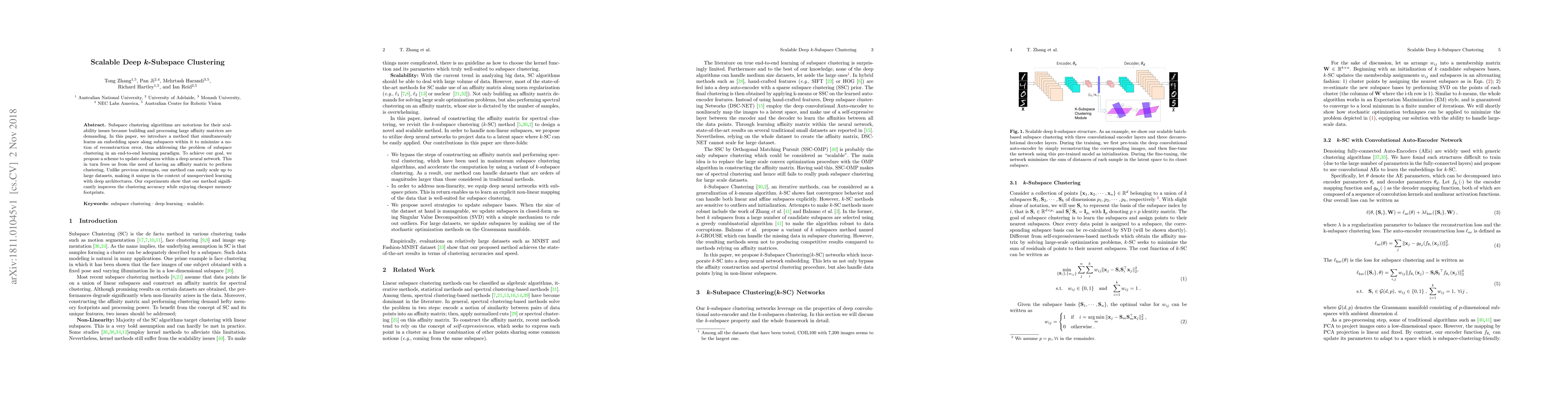 This paper proposes a scalable deep learning method for subspace clustering that learns an embedding space and updates subspaces within a neural network, eliminating the need for large affinity matrices. The approach significantly improves clustering accuracy and scales efficiently to large datasets.