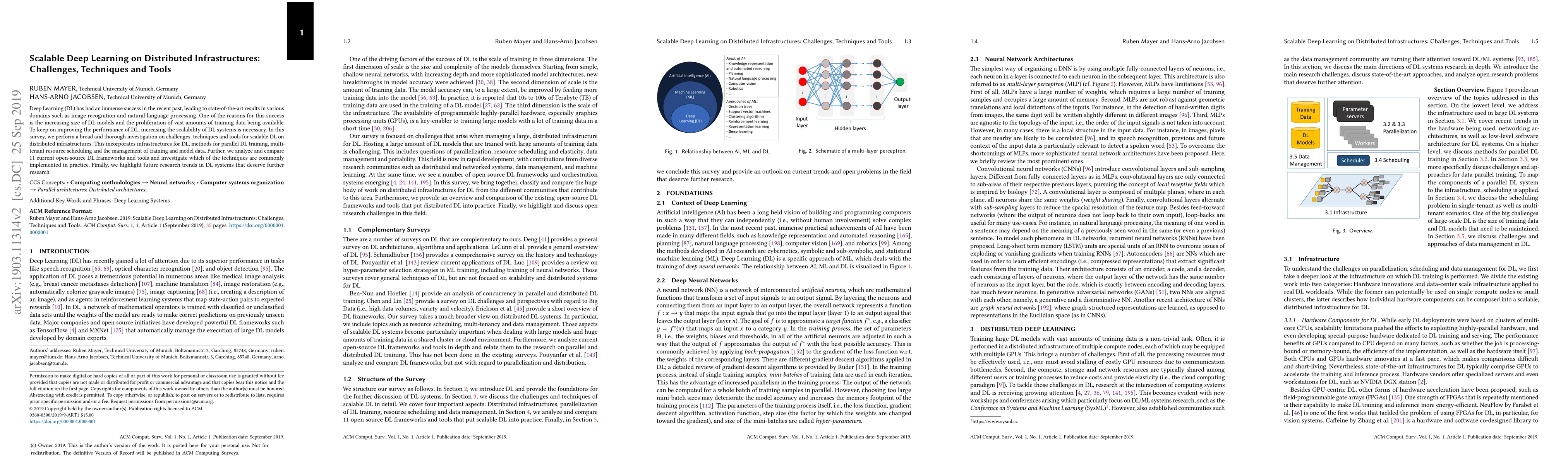Deep Learning (DL) has had an immense success in the recent past, leading to state-of-the-art results in various domains such as image recognition and natural language processing. One of the reasons for this success is the increasing size of DL models and the proliferation of vast amounts of training data being available. To keep on improving the performance of DL, increasing the scalability of DL systems is necessary. In this survey, we perform a broad and thorough investigation on challenges, techniques and tools for scalable DL on distributed infrastructures. This incorporates infrastructures for DL, methods for parallel DL training, multi-tenant resource scheduling and the management of training and model data. Further, we analyze and compare 11 current open-source DL frameworks and tools and investigate which of the techniques are commonly implemented in practice. Finally, we highlight future research trends in DL systems that deserve further research.