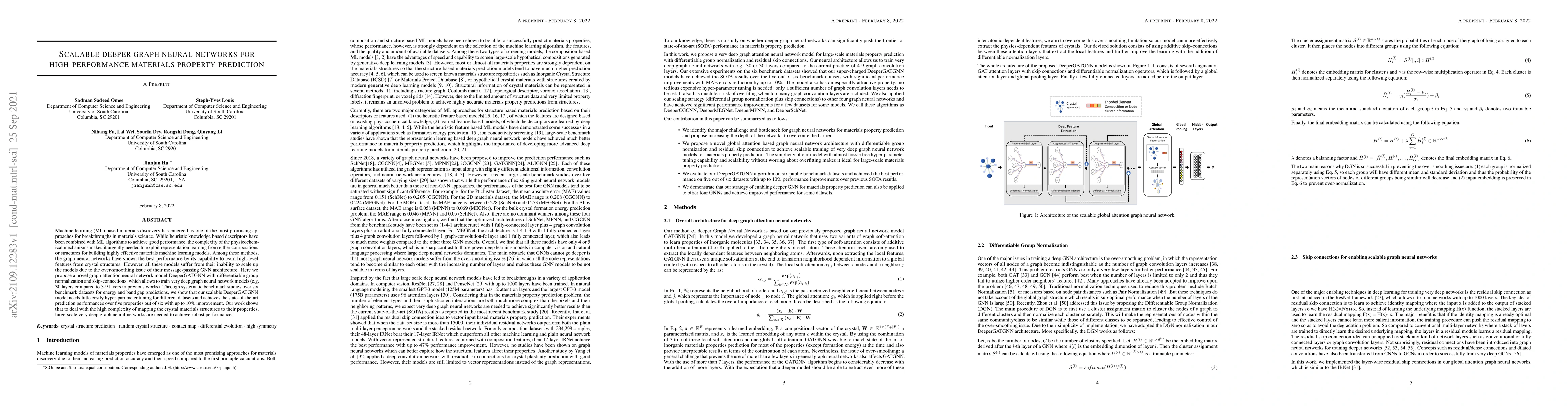This paper proposes a scalable DeeperGATGNN model with differentiable group normalization and skip-connections to address the over-smoothing issue in graph neural networks, enabling the training of very deep models (up to 30 layers). The model achieves state-of-the-art performance in predicting material properties across six benchmark datasets, demonstrating the necessity of large-scale deep networks for complex material structure-property mappings.