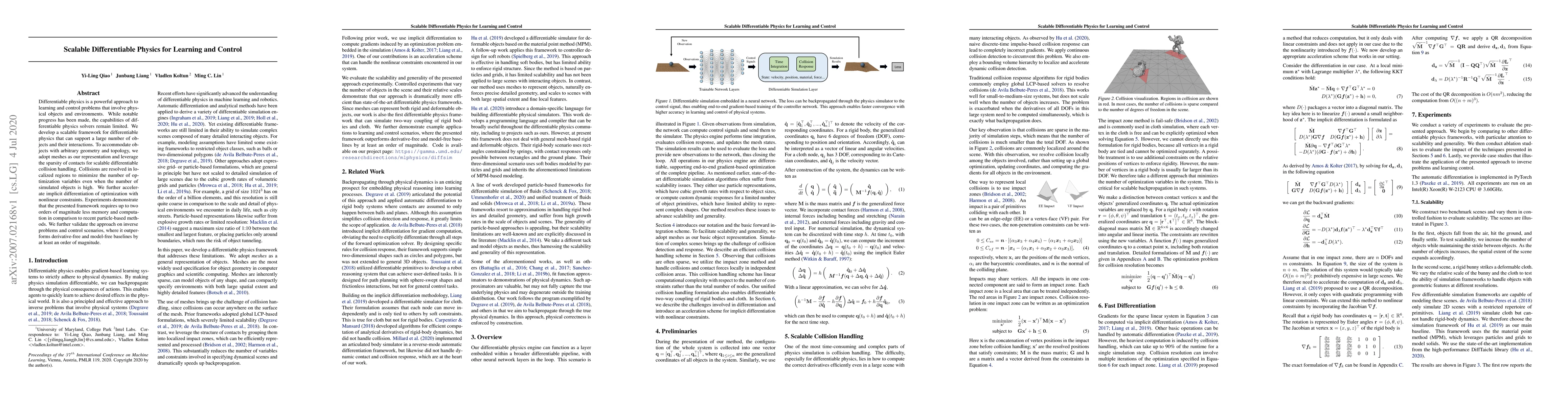 This paper introduces a scalable framework for differentiable physics that efficiently handles a large number of objects and their interactions using mesh representations and localized collision resolution. The framework significantly reduces memory and computational requirements compared to particle-based methods, demonstrating superior performance in inverse problems and control scenarios.