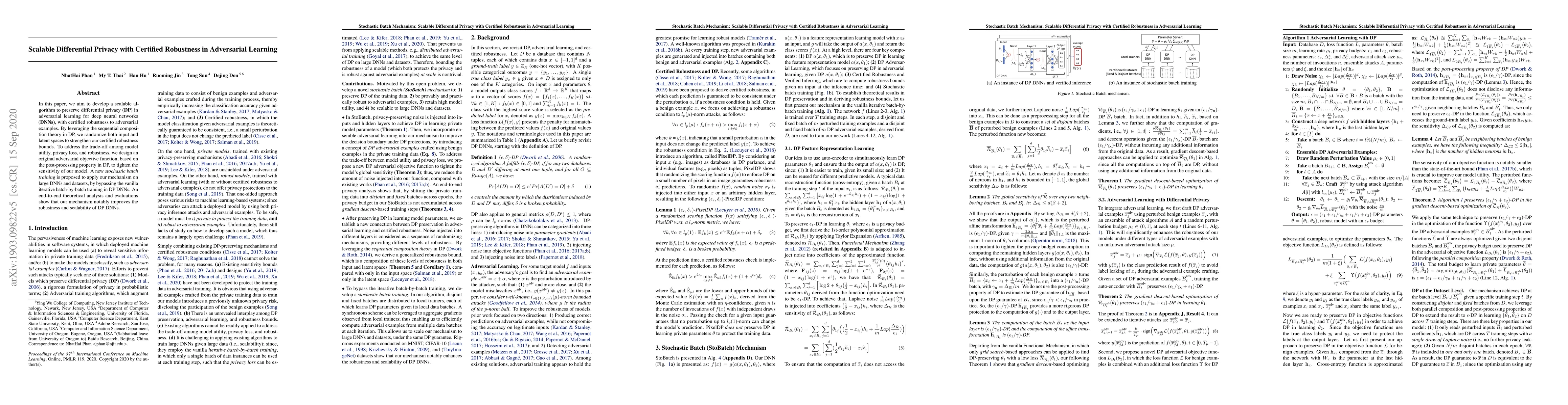 In this paper, we aim to develop a scalable algorithm to preserve differential privacy (DP) in adversarial learning for deep neural networks (DNNs), with certified robustness to adversarial examples. By leveraging the sequential composition theory in DP, we randomize both input and latent spaces to strengthen our certified robustness bounds. To address the trade-off among model utility, privacy loss, and robustness, we design an original adversarial objective function, based on the post-processing property in DP, to tighten the sensitivity of our model. A new stochastic batch training is proposed to apply our mechanism on large DNNs and datasets, by bypassing the vanilla iterative batch-by-batch training in DP DNNs. An end-to-end theoretical analysis and evaluations show that our mechanism notably improves the robustness and scalability of DP DNNs.