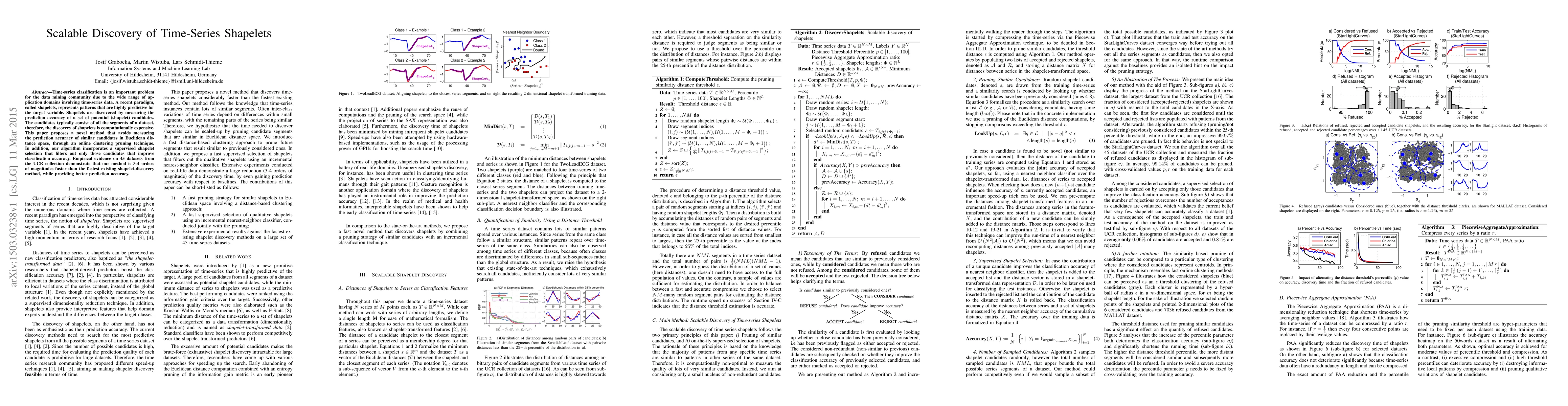 This paper introduces a novel method for discovering time-series shapelets that are highly predictive for classification tasks, significantly reducing computational costs through an online clustering pruning technique and supervised shapelet selection. Empirical results show the method is orders of magnitude faster than existing approaches while maintaining or improving prediction accuracy.