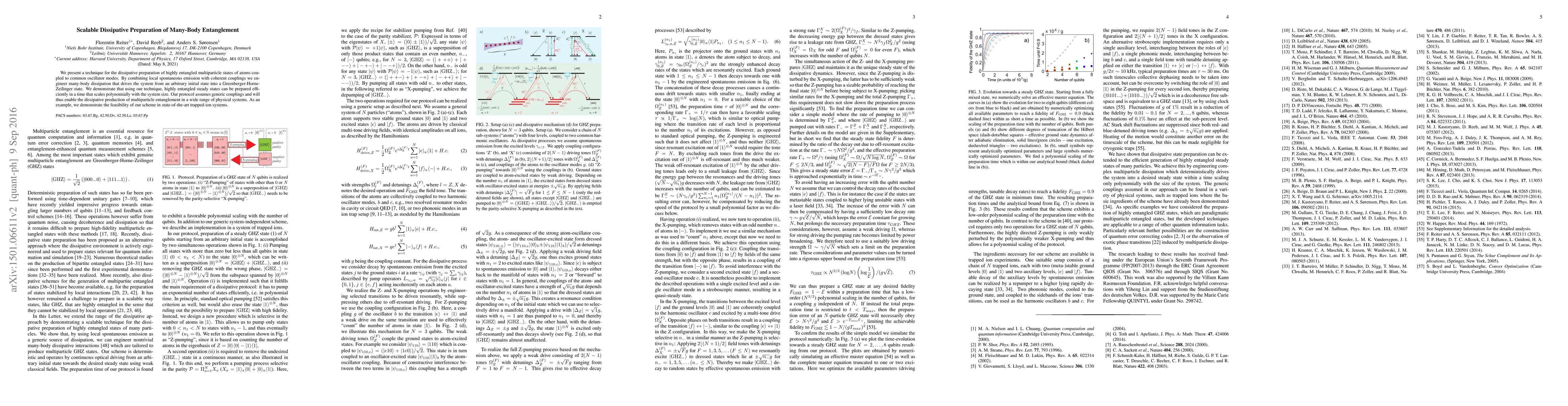 This paper introduces a scalable method for preparing highly entangled Greenberger-Horne-Zeilinger states through many-body dissipative processes in atomic systems. The technique combines local spontaneous emission with coherent couplings, enabling efficient preparation of entangled states in a time that scales polynomially with system size.