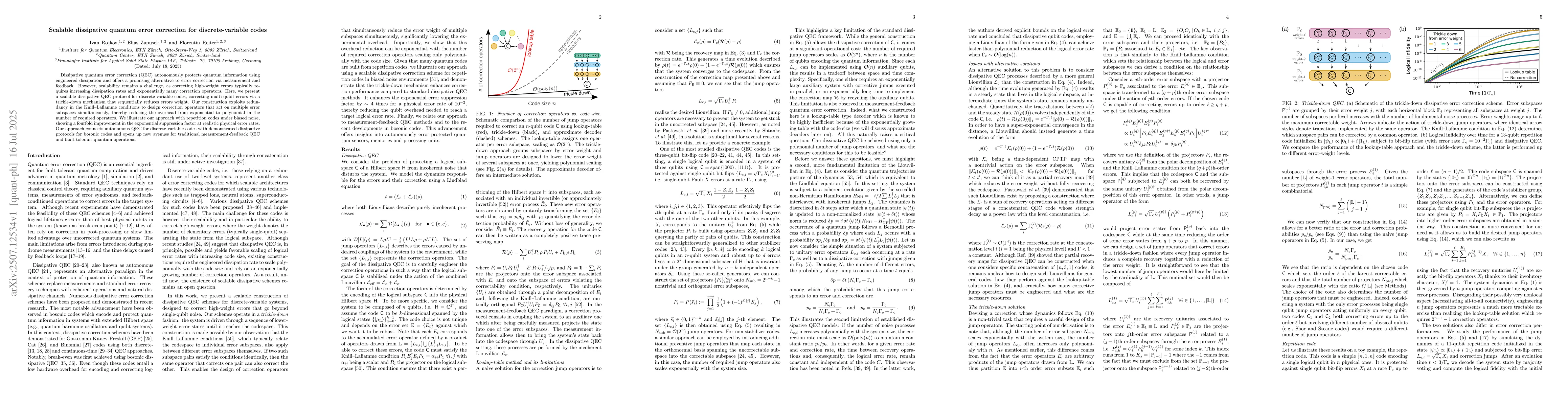 The research introduces a novel scalable dissipative quantum error correction (QEC) protocol for discrete-variable codes, correcting high-weight errors via a trickle-down mechanism that sequentially reduces error weight, contrasting with conventional lookup-table methods.