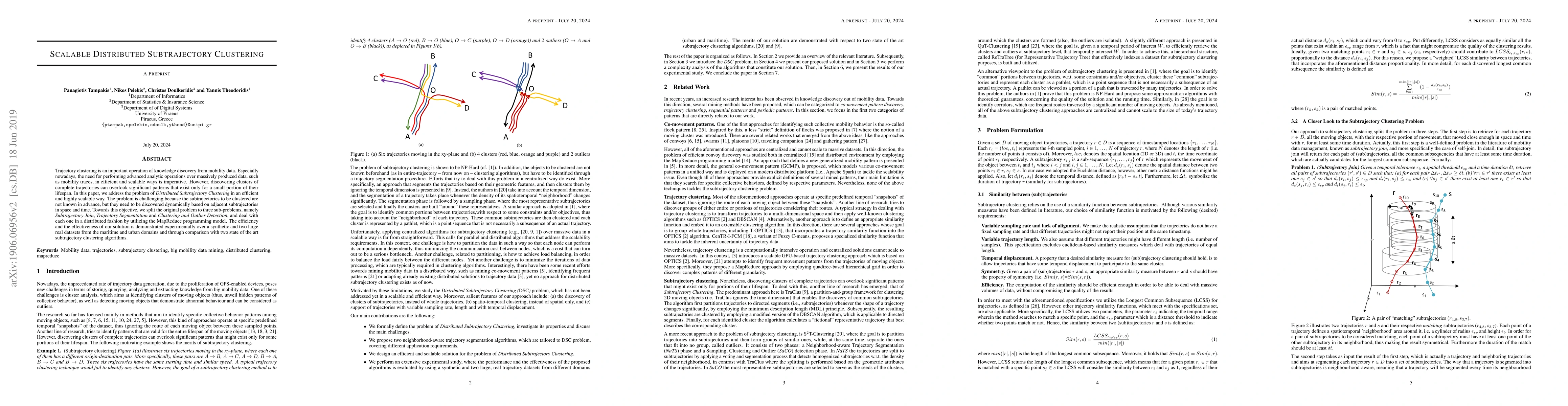 This paper proposes a scalable distributed approach for clustering subtrajectories dynamically discovered from mobility data. It addresses the challenge by splitting the problem into Subtrajectory Join, Trajectory Segmentation and Clustering, and Outlier Detection, and solves each sub-problem using MapReduce, demonstrating efficiency and effectiveness through experiments on synthetic and real maritime and urban datasets.