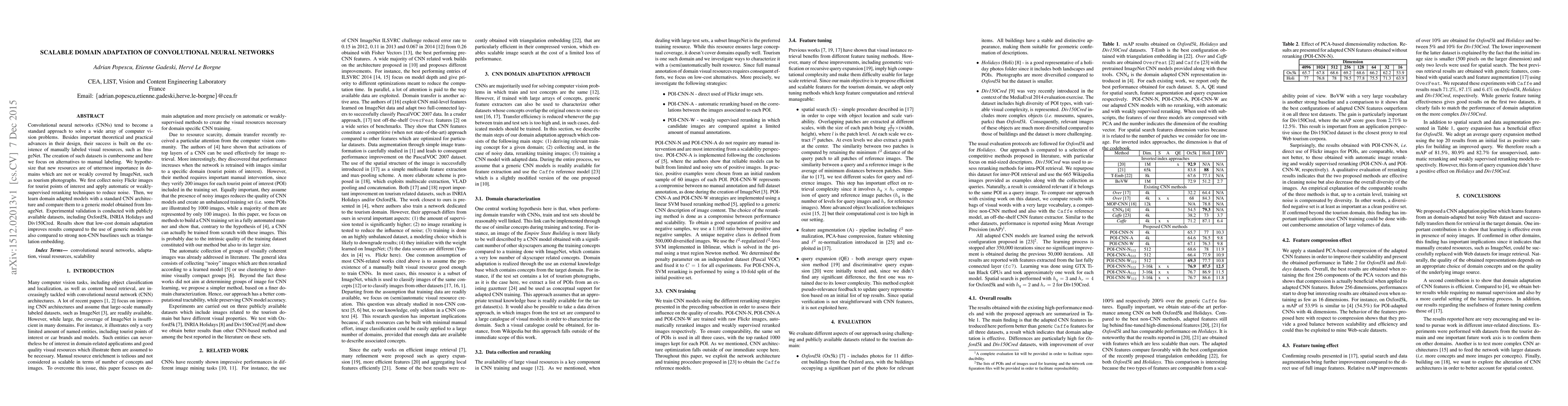 This paper explores scalable domain adaptation for CNNs to address the lack of labeled data in niche domains, like tourism photographs, by using noisy Flickr images and weakly-supervised techniques. Experimental results show that domain-adapted CNNs outperform both generic models and non-CNN baselines.