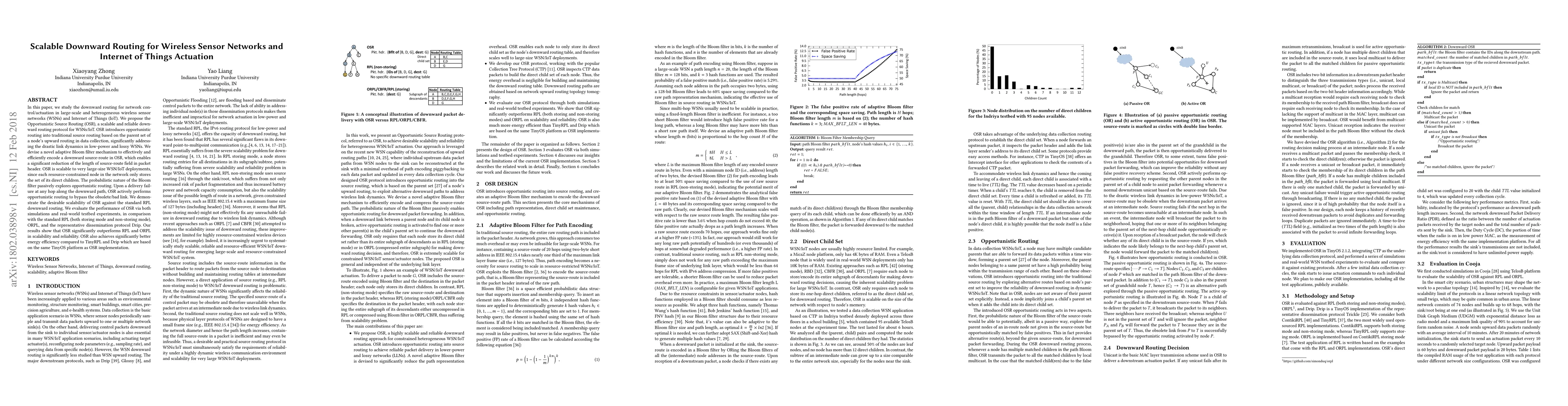 This paper proposes a scalable and reliable downward routing protocol called Opportunistic Source Routing (OSR) for large-scale wireless sensor networks and IoT. OSR employs an adaptive Bloom filter mechanism to reduce packet header size and scales efficiently by storing only direct children's sets. Experimental results show OSR significantly outperforms standard RPL and ORPL in terms of scalability, reliability, and energy efficiency.