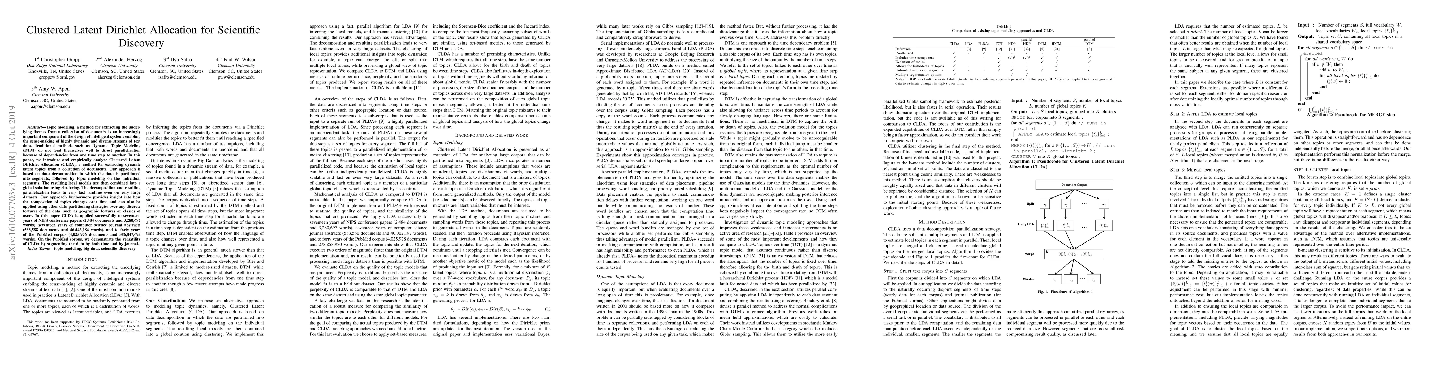 Topic modeling, a method for extracting the underlying themes from a collection of documents, is an increasingly important component of the design of intelligent systems enabling the sense-making of highly dynamic and diverse streams of text data. Traditional methods such as Dynamic Topic Modeling (DTM) do not lend themselves well to direct parallelization because of dependencies from one time step to another. In this paper, we introduce and empirically analyze Clustered Latent Dirichlet Allocation (CLDA), a method for extracting dynamic latent topics from a collection of documents. Our approach is based on data decomposition in which the data is partitioned into segments, followed by topic modeling on the individual segments. The resulting local models are then combined into a global solution using clustering. The decomposition and resulting parallelization leads to very fast runtime even on very large datasets. Our approach furthermore provides insight into how the composition of topics changes over time and can also be applied using other data partitioning strategies over any discrete features of the data, such as geographic features or classes of users. In this paper CLDA is applied successfully to seventeen years of NIPS conference papers (2,484 documents and 3,280,697 words), seventeen years of computer science journal abstracts (533,560 documents and 32,551,540 words), and to forty years of the PubMed corpus (4,025,978 documents and 273,853,980 words).