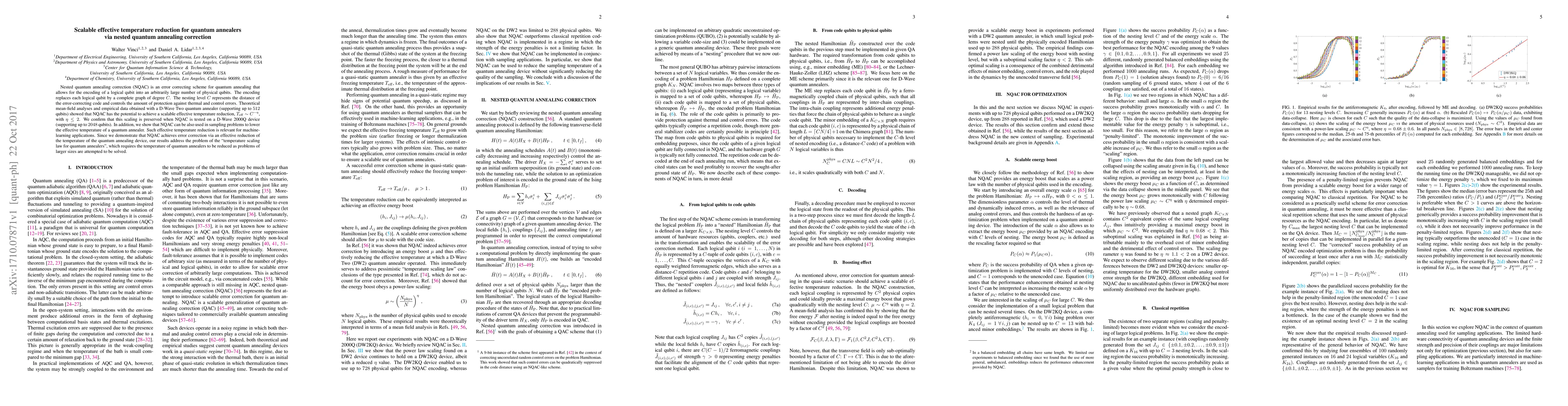 The paper proposes Nested Quantum Annealing Correction (NQAC) as an error-correcting scheme that scales effectively to reduce the effective temperature of quantum annealers, thereby addressing the "temperature scaling law" for larger problem sizes. Empirical tests on D-Wave devices confirm that NQAC achieves a scalable effective temperature reduction, $T_{\rm eff} \sim C^{-\eta}$, with $\eta \leq 2$, enhancing its applicability for machine-learning tasks.