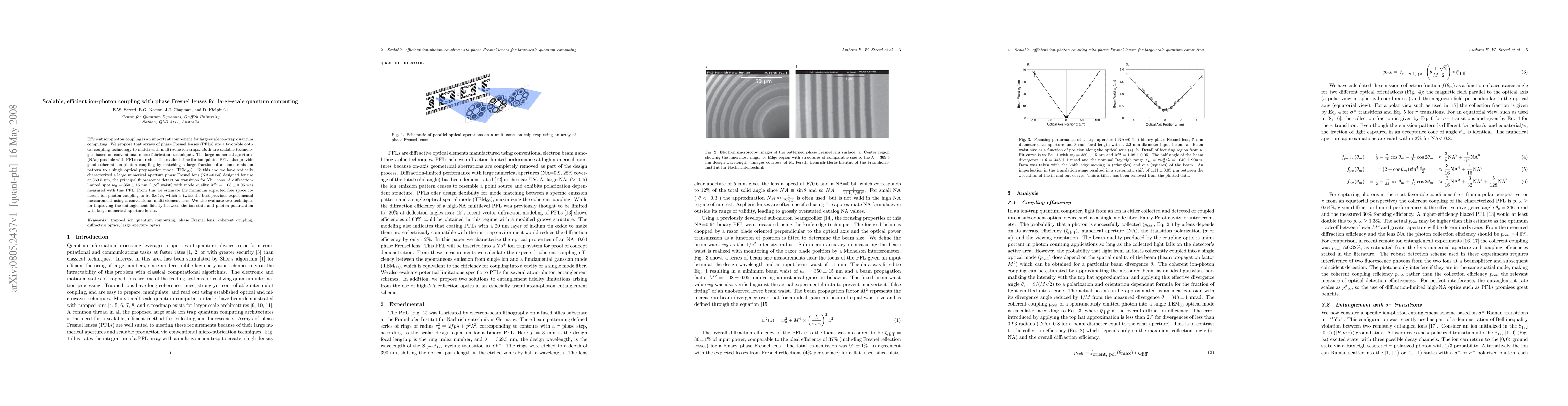 Efficient ion-photon coupling is an important component for large-scale ion-trap quantum computing. We propose that arrays of phase Fresnel lenses (PFLs) are a favorable optical coupling technology to match with multi-zone ion traps. Both are scalable technologies based on conventional micro-fabrication techniques. The large numerical apertures (NAs) possible with PFLs can reduce the readout time for ion qubits. PFLs also provide good coherent ion-photon coupling by matching a large fraction of an ion's emission pattern to a single optical propagation mode (TEM00). To this end we have optically characterized a large numerical aperture phase Fresnel lens (NA=0.64) designed for use at 369.5 nm, the principal fluorescence detection transition for Yb+ ions. A diffraction-limited spot w0=350+/-15 nm (1/e^2 waist) with mode quality M^2= 1.08+/-0.05 was measured with this PFL. From this we estimate the minimum expected free space coherent ion-photon coupling to be 0.64%, which is twice the best previous experimental measurement using a conventional multi-element lens. We also evaluate two techniques for improving the entanglement fidelity between the ion state and photon polarization with large numerical aperture lenses.