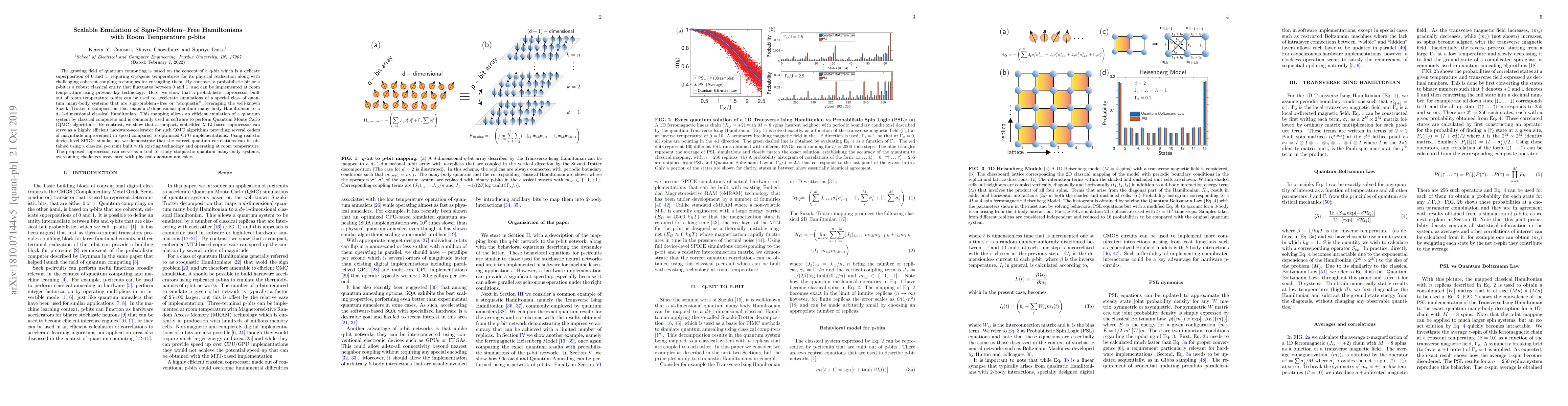 The growing field of quantum computing is based on the concept of a q-bit which is a delicate superposition of 0 and 1, requiring cryogenic temperatures for its physical realization along with challenging coherent coupling techniques for entangling them. By contrast, a probabilistic bit or a p-bit is a robust classical entity that fluctuates between 0 and 1, and can be implemented at room temperature using present-day technology. Here, we show that a probabilistic coprocessor built out of room temperature p-bits can be used to accelerate simulations of a special class of quantum many-body systems that are sign-problem$-$free or stoquastic, leveraging the well-known Suzuki-Trotter decomposition that maps a $d$-dimensional quantum many body Hamiltonian to a $d$+1-dimensional classical Hamiltonian. This mapping allows an efficient emulation of a quantum system by classical computers and is commonly used in software to perform Quantum Monte Carlo (QMC) algorithms. By contrast, we show that a compact, embedded MTJ-based coprocessor can serve as a highly efficient hardware-accelerator for such QMC algorithms providing several orders of magnitude improvement in speed compared to optimized CPU implementations. Using realistic device-level SPICE simulations we demonstrate that the correct quantum correlations can be obtained using a classical p-circuit built with existing technology and operating at room temperature. The proposed coprocessor can serve as a tool to study stoquastic quantum many-body systems, overcoming challenges associated with physical quantum annealers.