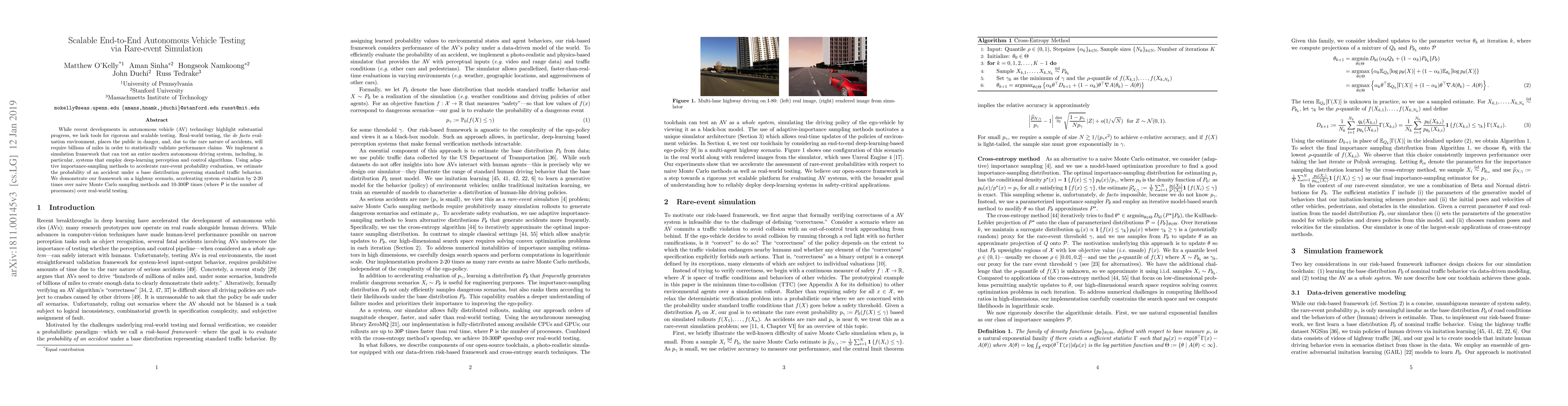 While recent developments in autonomous vehicle (AV) technology highlight substantial progress, we lack tools for rigorous and scalable testing. Real-world testing, the $\textit{de facto}$ evaluation environment, places the public in danger, and, due to the rare nature of accidents, will require billions of miles in order to statistically validate performance claims. We implement a simulation framework that can test an entire modern autonomous driving system, including, in particular, systems that employ deep-learning perception and control algorithms. Using adaptive importance-sampling methods to accelerate rare-event probability evaluation, we estimate the probability of an accident under a base distribution governing standard traffic behavior. We demonstrate our framework on a highway scenario, accelerating system evaluation by $2$-$20$ times over naive Monte Carlo sampling methods and $10$-$300 \mathsf{P}$ times (where $\mathsf{P}$ is the number of processors) over real-world testing.