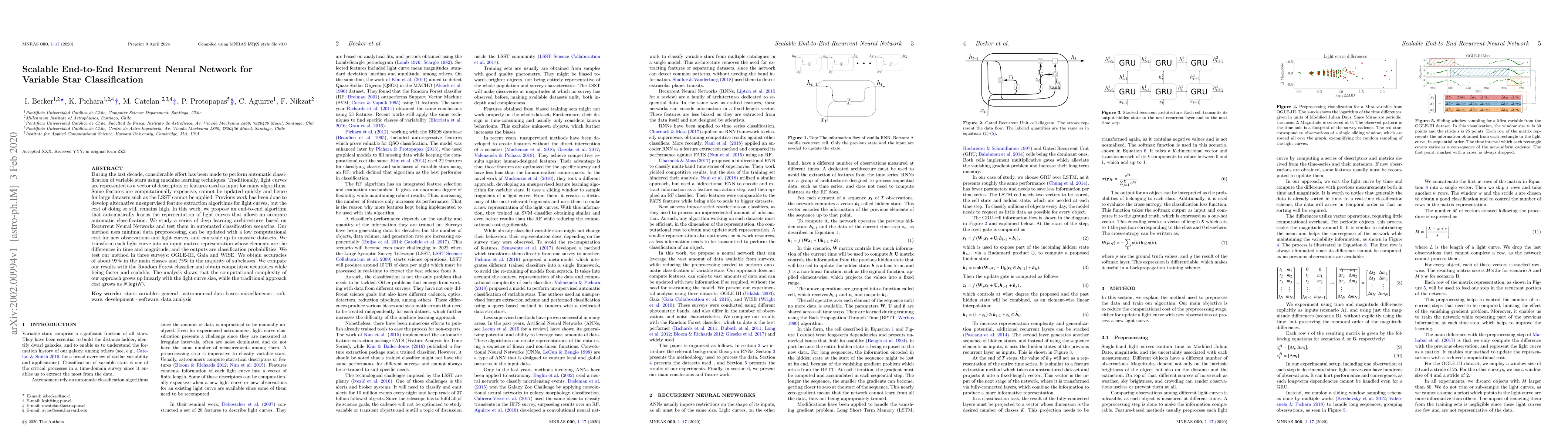 A new end-to-end recurrent neural network is proposed for automatic classification of variable stars, achieving 95% accuracy in main classes and 75% in subclasses, outperforming traditional methods with faster scalability and lower computational cost.