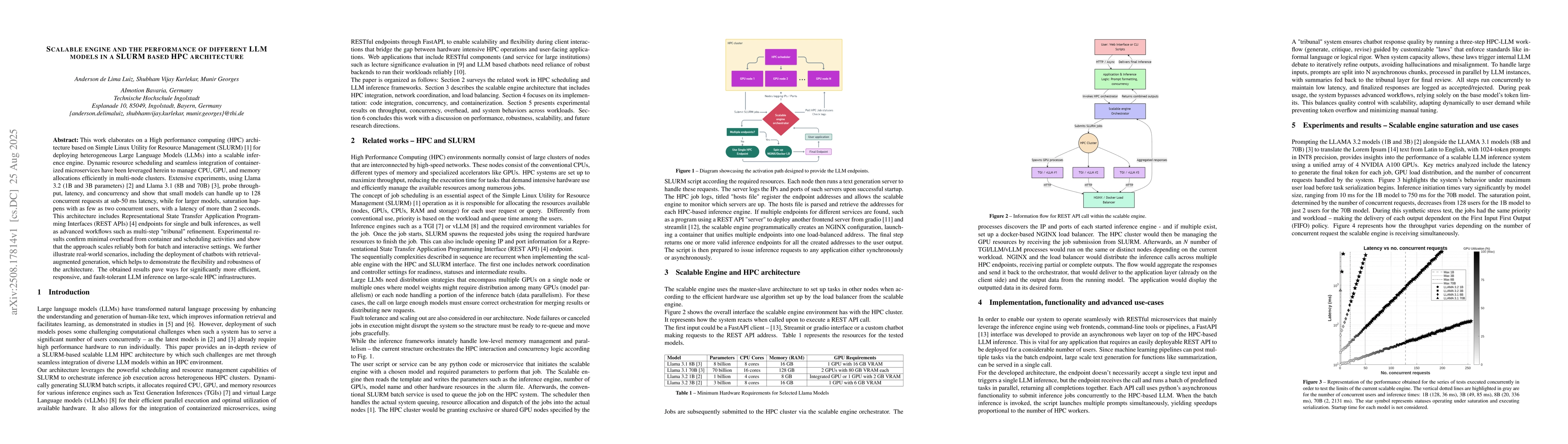 This work elaborates on a High performance computing (HPC) architecture based on Simple Linux Utility for Resource Management (SLURM) [1] for deploying heterogeneous Large Language Models (LLMs) into a scalable inference engine. Dynamic resource scheduling and seamless integration of containerized microservices have been leveraged herein to manage CPU, GPU, and memory allocations efficiently in multi-node clusters. Extensive experiments, using Llama 3.2 (1B and 3B parameters) [2] and Llama 3.1 (8B and 70B) [3], probe throughput, latency, and concurrency and show that small models can handle up to 128 concurrent requests at sub-50 ms latency, while for larger models, saturation happens with as few as two concurrent users, with a latency of more than 2 seconds. This architecture includes Representational State Transfer Application Programming Interfaces (REST APIs) [4] endpoints for single and bulk inferences, as well as advanced workflows such as multi-step "tribunal" refinement. Experimental results confirm minimal overhead from container and scheduling activities and show that the approach scales reliably both for batch and interactive settings. We further illustrate real-world scenarios, including the deployment of chatbots with retrievalaugmented generation, which helps to demonstrate the flexibility and robustness of the architecture. The obtained results pave ways for significantly more efficient, responsive, and fault-tolerant LLM inference on large-scale HPC infrastructures.