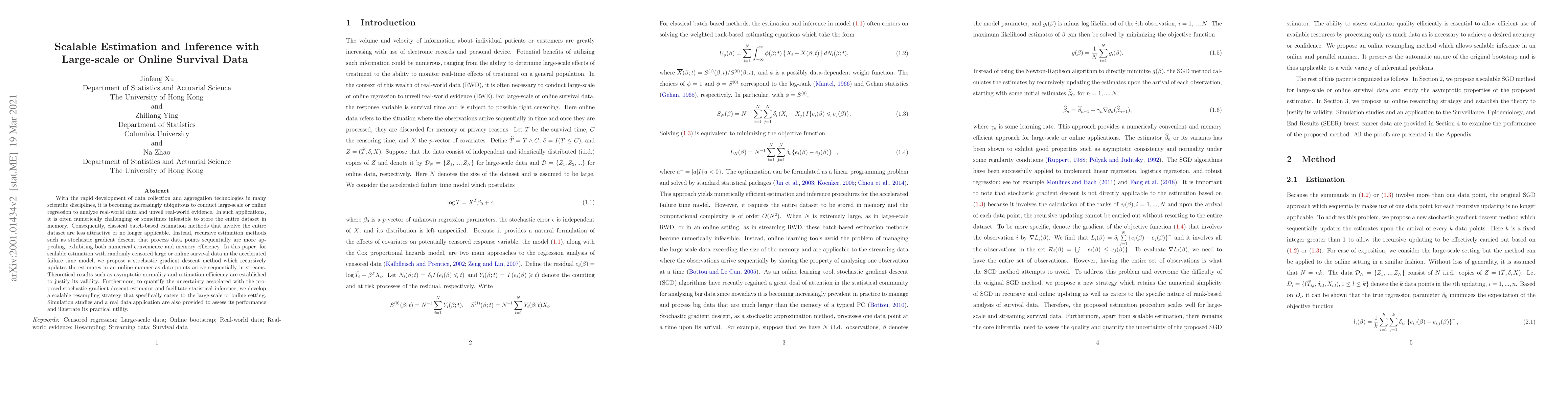 This paper proposes a stochastic gradient descent method for scalable estimation and inference of large-scale or online survival data, addressing the challenge of processing data sequentially without storing the entire dataset. It establishes theoretical properties and develops a scalable resampling strategy for uncertainty quantification, validated through simulations and real-data applications.