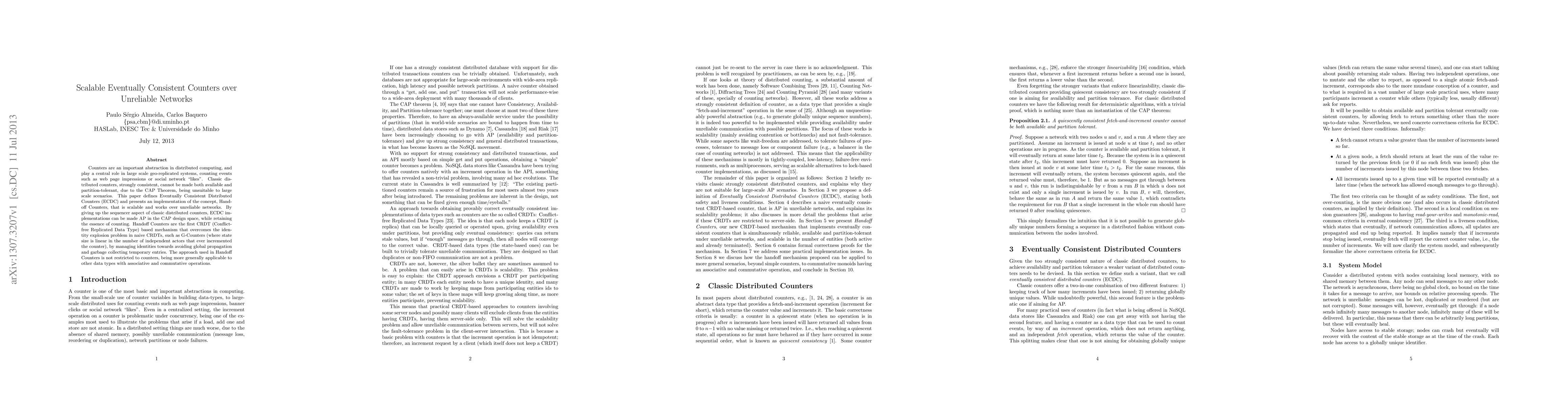 Counters are an important abstraction in distributed computing, and play a central role in large scale geo-replicated systems, counting events such as web page impressions or social network "likes". Classic distributed counters, strongly consistent, cannot be made both available and partition-tolerant, due to the CAP Theorem, being unsuitable to large scale scenarios. This paper defines Eventually Consistent Distributed Counters (ECDC) and presents an implementation of the concept, Handoff Counters, that is scalable and works over unreliable networks. By giving up the sequencer aspect of classic distributed counters, ECDC implementations can be made AP in the CAP design space, while retaining the essence of counting. Handoff Counters are the first CRDT (Conflict-free Replicated Data Type) based mechanism that overcomes the identity explosion problem in naive CRDTs, such as G-Counters (where state size is linear in the number of independent actors that ever incremented the counter), by managing identities towards avoiding global propagation and garbage collecting temporary entries. The approach used in Handoff Counters is not restricted to counters, being more generally applicable to other data types with associative and commutative operations.