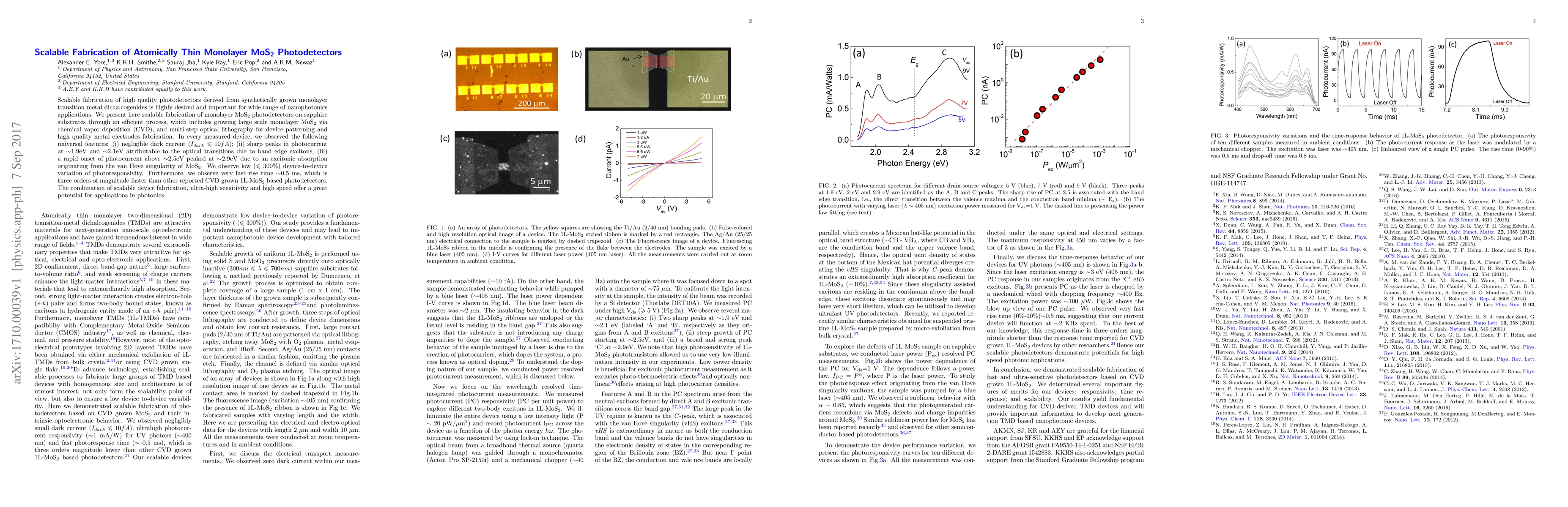 This paper presents scalable fabrication of high-quality monolayer MoS2 photodetectors using chemical vapor deposition and multi-step optical lithography, achieving negligible dark current, sharp photocurrent peaks, and ultra-fast response times, with low device-to-device variation and high sensitivity for photonics applications.
