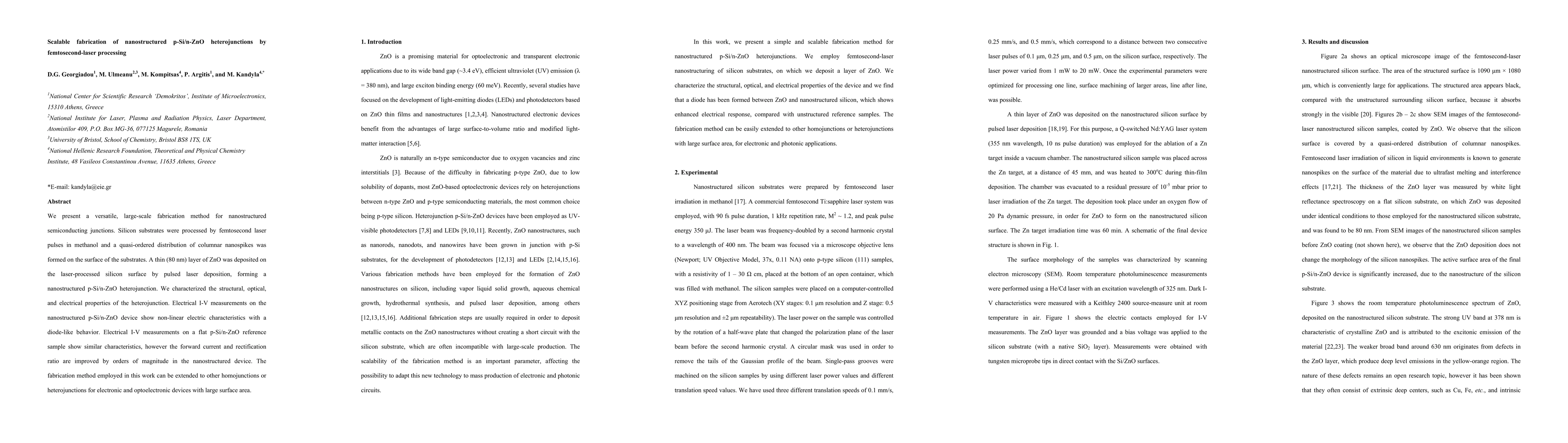 This paper details a scalable method for creating nanostructured p-Si/n-ZnO heterojunctions using femtosecond laser processing, resulting in improved electrical properties and diode-like behavior compared to flat samples. The technique can be applied to fabricate various electronic and optoelectronic devices.