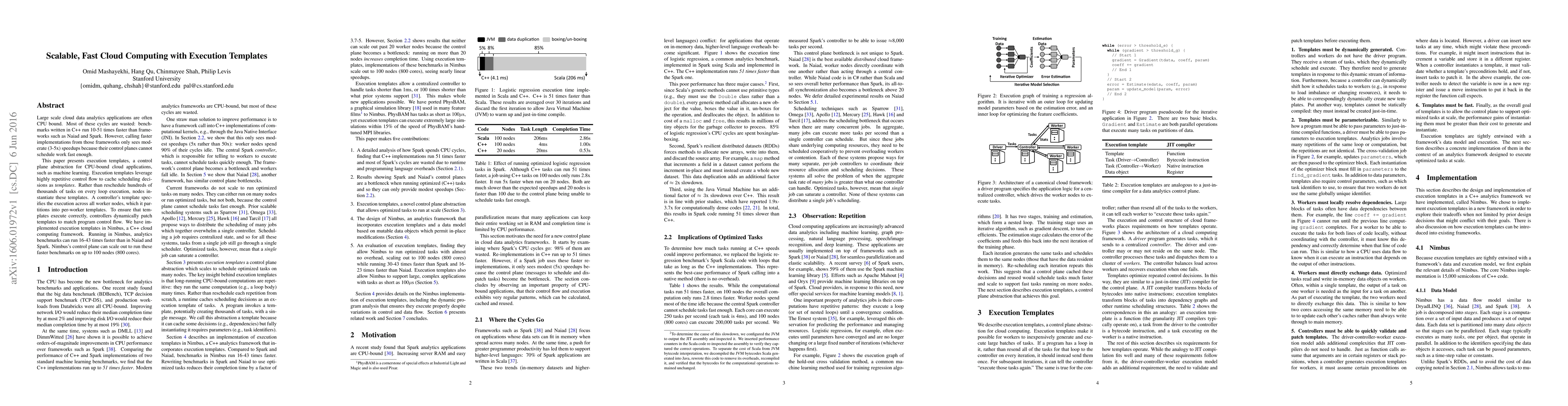 Large scale cloud data analytics applications are often CPU bound. Most of these cycles are wasted: benchmarks written in C++ run 10-51 times faster than frameworks such as Naiad and Spark. However, calling faster implementations from those frameworks only sees moderate (3-5x) speedups because their control planes cannot schedule work fast enough. This paper presents execution templates, a control plane abstraction for CPU-bound cloud applications, such as machine learning. Execution templates leverage highly repetitive control flow to cache scheduling decisions as {\it templates}. Rather than reschedule hundreds of thousands of tasks on every loop execution, nodes instantiate these templates. A controller's template specifies the execution across all worker nodes, which it partitions into per-worker templates. To ensure that templates execute correctly, controllers dynamically patch templates to match program control flow. We have implemented execution templates in Nimbus, a C++ cloud computing framework. Running in Nimbus, analytics benchmarks can run 16-43 times faster than in Naiad and Spark. Nimbus's control plane can scale out to run these faster benchmarks on up to 100 nodes (800 cores).