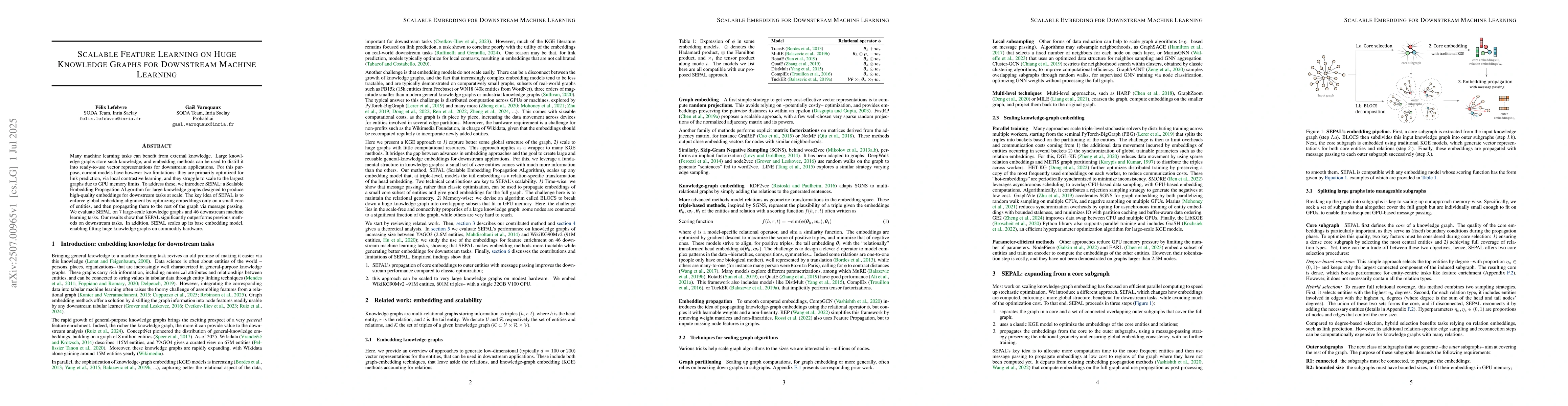 Many machine learning tasks can benefit from external knowledge. Large knowledge graphs store such knowledge, and embedding methods can be used to distill it into ready-to-use vector representations for downstream applications. For this purpose, current models have however two limitations: they are primarily optimized for link prediction, via local contrastive learning, and they struggle to scale to the largest graphs due to GPU memory limits. To address these, we introduce SEPAL: a Scalable Embedding Propagation ALgorithm for large knowledge graphs designed to produce high-quality embeddings for downstream tasks at scale. The key idea of SEPAL is to enforce global embedding alignment by optimizing embeddings only on a small core of entities, and then propagating them to the rest of the graph via message passing. We evaluate SEPAL on 7 large-scale knowledge graphs and 46 downstream machine learning tasks. Our results show that SEPAL significantly outperforms previous methods on downstream tasks. In addition, SEPAL scales up its base embedding model, enabling fitting huge knowledge graphs on commodity hardware.