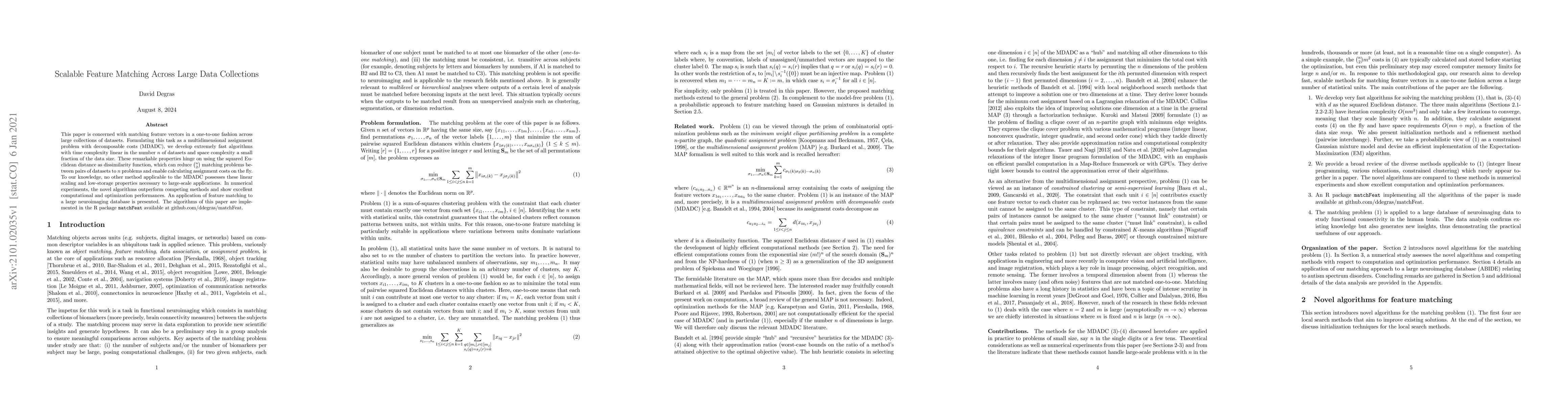 This paper introduces a novel algorithm for feature matching across large data collections, achieving linear time complexity and low storage requirements, with impressive performance in numerical experiments.