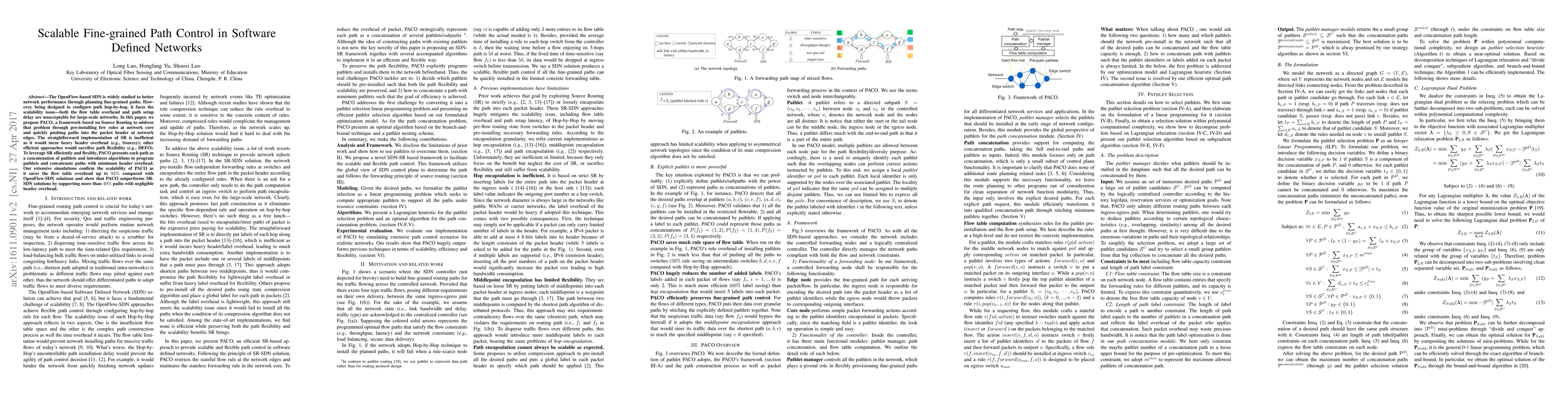 This paper proposes PACO, a Source Routing-based framework for scalable fine-grained path control in OpenFlow-based Software Defined Networks (SDN), addressing scalability issues by minimizing flow table overhead and path setup delay. PACO efficiently implements Source Routing by using pathlets to concatenate paths with minimal label overhead, achieving up to 94% reduction in flow table overhead compared to OpenFlow-SDN.