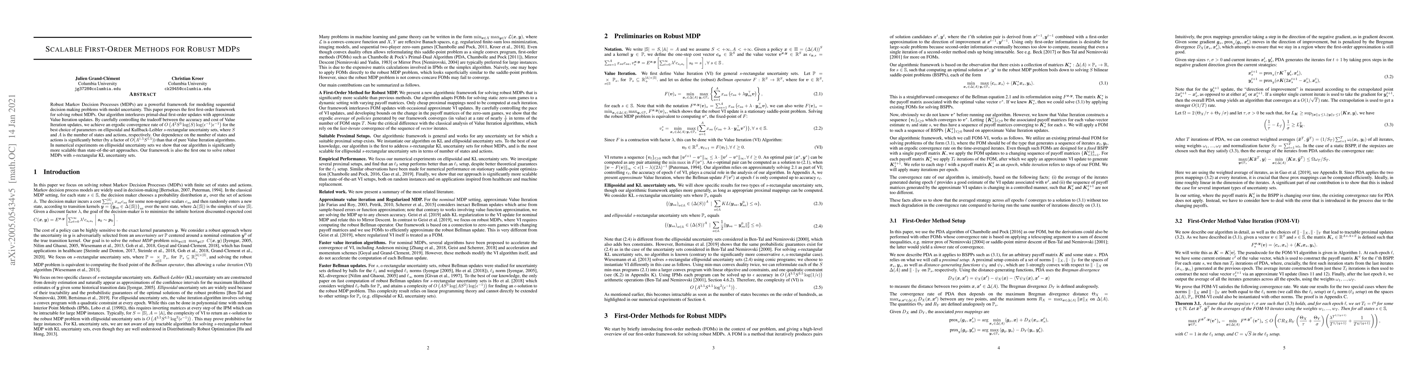 This paper introduces a scalable first-order algorithm for solving robust Markov Decision Processes (MDPs), achieving an improved convergence rate and significantly better scalability compared to traditional Value Iteration methods, especially for large state and action spaces. The proposed method interleaves primal-dual updates with approximate Value Iteration, demonstrating superior performance in numerical experiments.