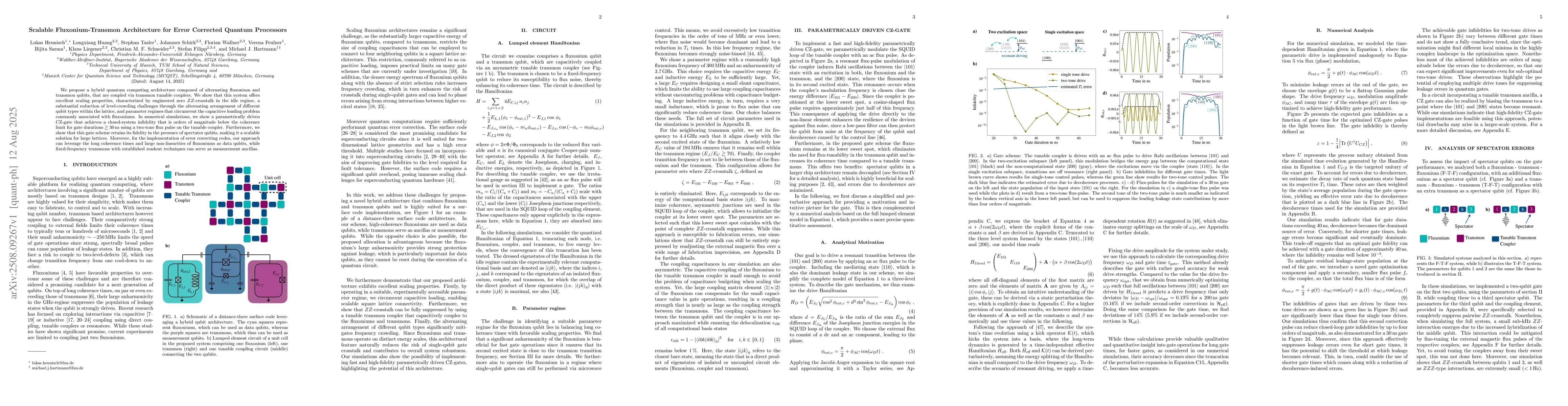 We propose a hybrid quantum computing architecture composed of alternating fluxonium and transmon qubits, that are coupled via transmon tunable couplers. We show that this system offers excellent scaling properties, characterized by engineered zero $ZZ$-crosstalk in the idle regime, a substantial reduction of level-crowding challenges through the alternating arrangement of different qubit types within the lattice, and parameter regimes that circumvent the capacitive loading problem commonly associated with fluxoniums. In numerical simulations, we show a parametrically driven CZ-gate that achieves a closed-system infidelity that is orders of magnitude below the coherence limit for gate durations $\gtrsim 30\,\rm{ns}$ using a two-tone flux pulse on the tunable coupler. Furthermore, we show that this gate scheme retains its fidelity in the presence of spectator qubits, making it a scalable solution for large lattices. Moreover, for the implementation of error correcting codes, our approach can leverage the long coherence times and large non-linearities of fluxoniums as data qubits, while fixed-frequency transmons with established readout techniques can serve as measurement ancillas.