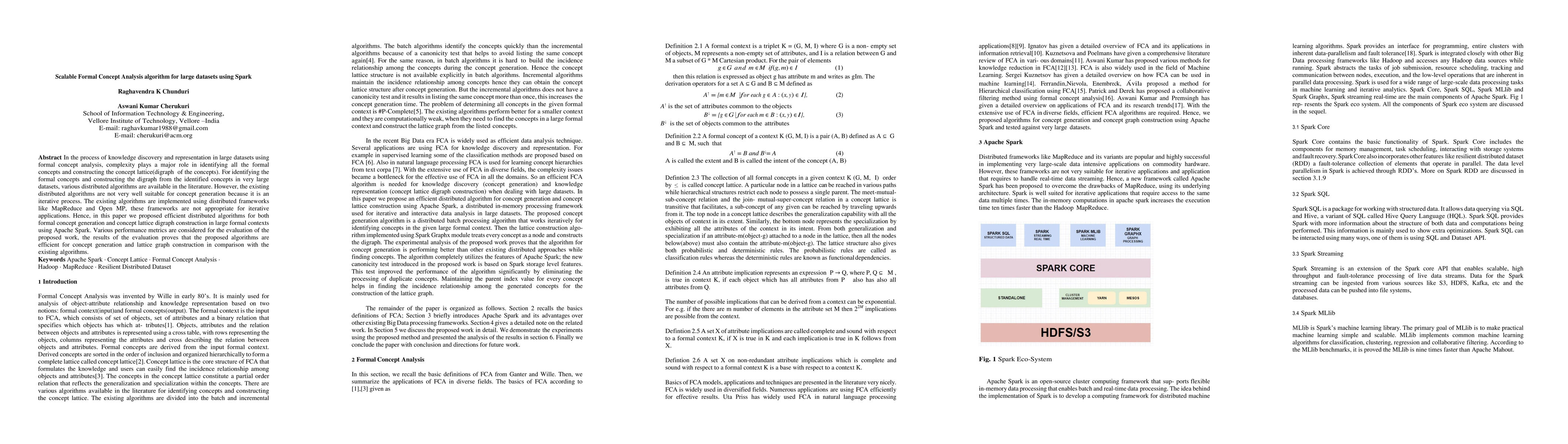 This paper proposes scalable distributed algorithms for formal concept analysis using Apache Spark to handle large datasets. The algorithms efficiently generate formal concepts and construct concept lattices, outperforming existing iterative process-based distributed methods, as demonstrated by performance evaluations.