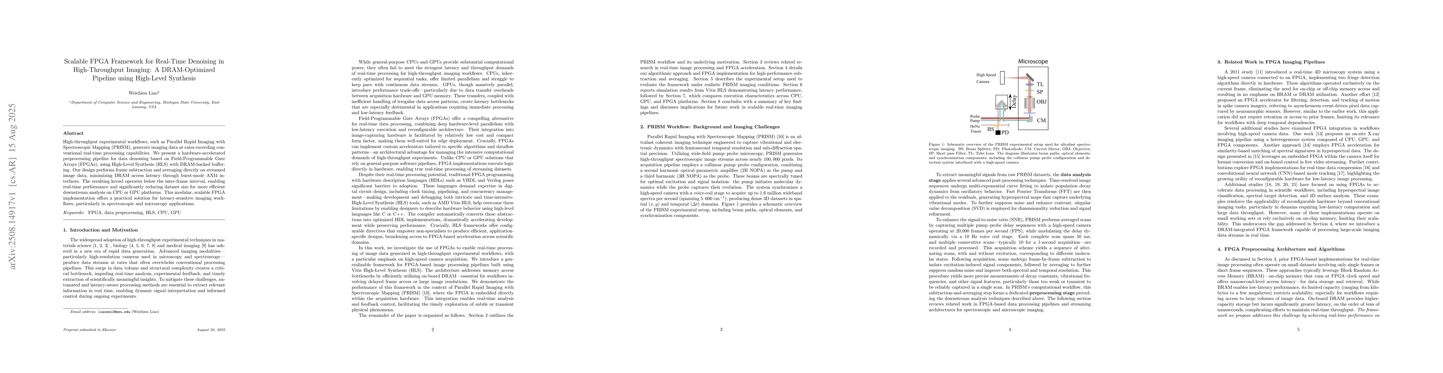 High-throughput imaging workflows, such as Parallel Rapid Imaging with Spectroscopic Mapping (PRISM), generate data at rates that exceed conventional real-time processing capabilities. We present a scalable FPGA-based preprocessing pipeline for real-time denoising, implemented via High-Level Synthesis (HLS) and optimized for DRAM-backed buffering. Our architecture performs frame subtraction and averaging directly on streamed image data, minimizing latency through burst-mode AXI4 interfaces. The resulting kernel operates below the inter-frame interval, enabling inline denoising and reducing dataset size for downstream CPU/GPU analysis. Validated under PRISM-scale acquisition, this modular FPGA framework offers a practical solution for latency-sensitive imaging workflows in spectroscopy and microscopy.