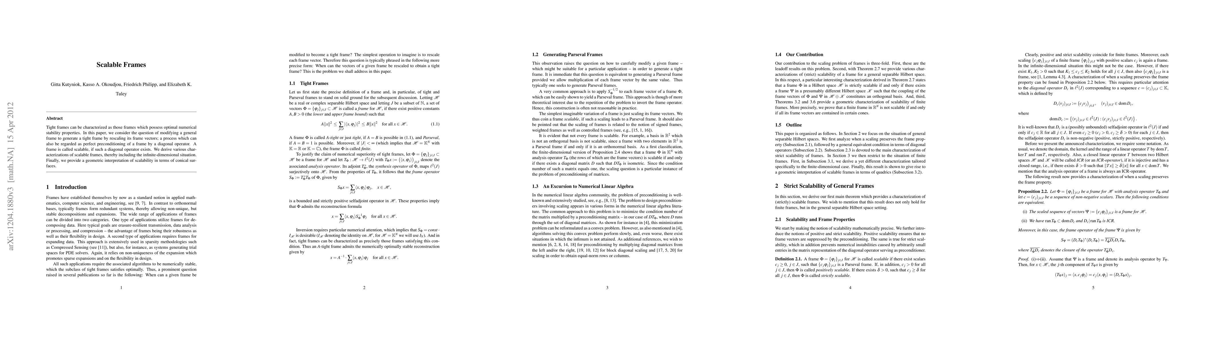 The paper contributes by establishing new conditions for scalability of frames, providing a geometric interpretation, and proving equivalence conditions for strict scalability, all of which enrich the theoretical framework of frame theory.