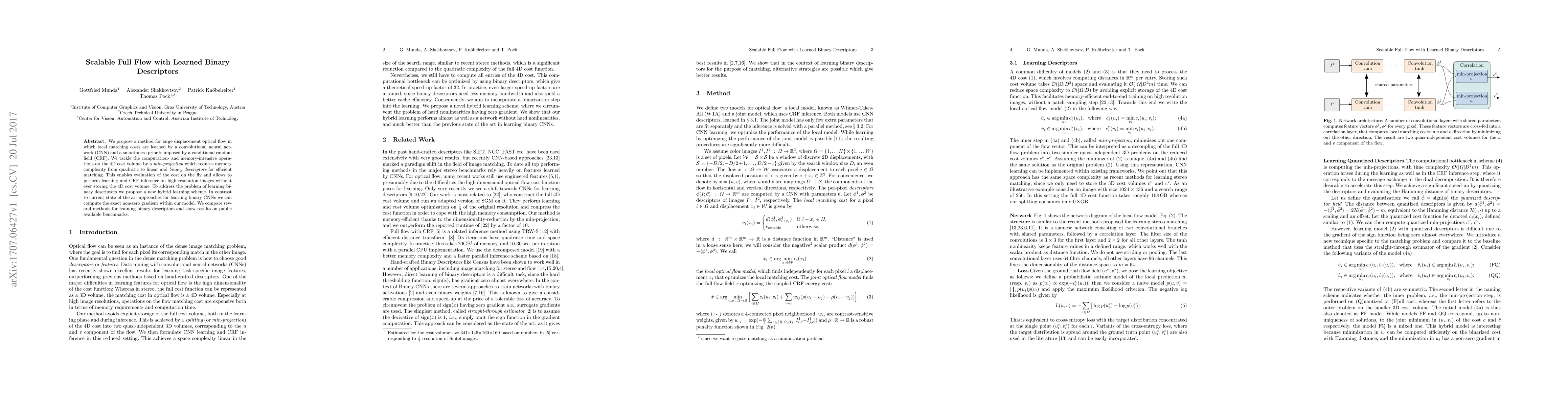 We propose a method for large displacement optical flow in which local matching costs are learned by a convolutional neural network (CNN) and a smoothness prior is imposed by a conditional random field (CRF). We tackle the computation- and memory-intensive operations on the 4D cost volume by a min-projection which reduces memory complexity from quadratic to linear and binary descriptors for efficient matching. This enables evaluation of the cost on the fly and allows to perform learning and CRF inference on high resolution images without ever storing the 4D cost volume. To address the problem of learning binary descriptors we propose a new hybrid learning scheme. In contrast to current state of the art approaches for learning binary CNNs we can compute the exact non-zero gradient within our model. We compare several methods for training binary descriptors and show results on public available benchmarks.