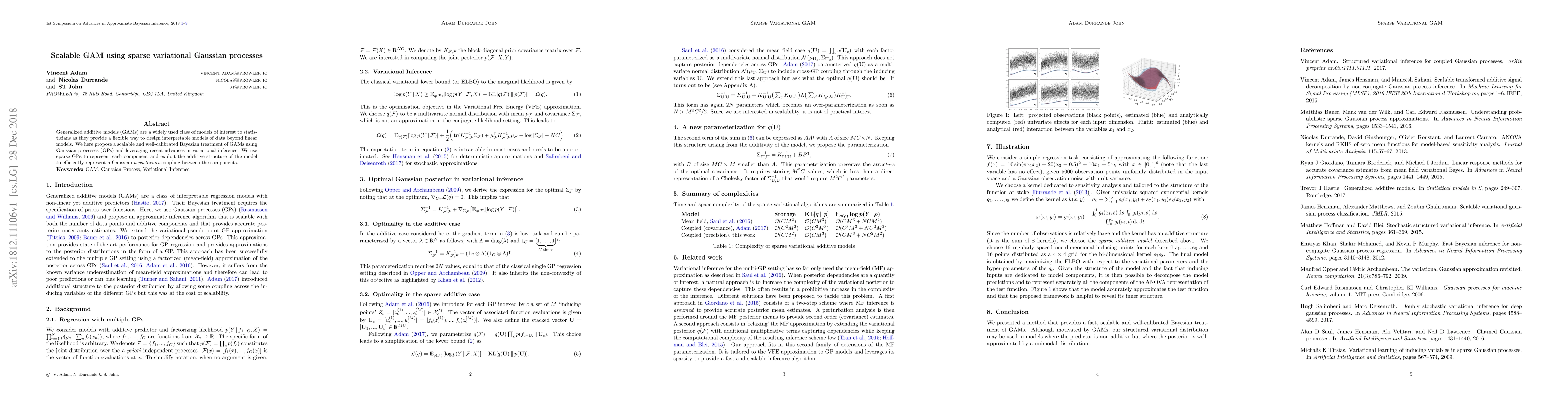 This paper proposes a scalable Bayesian approach to generalized additive models (GAMs) using sparse variational Gaussian processes, leveraging variational inference to efficiently represent the Gaussian posterior coupling between components. The method aims to provide a flexible and interpretable alternative to traditional linear models.
