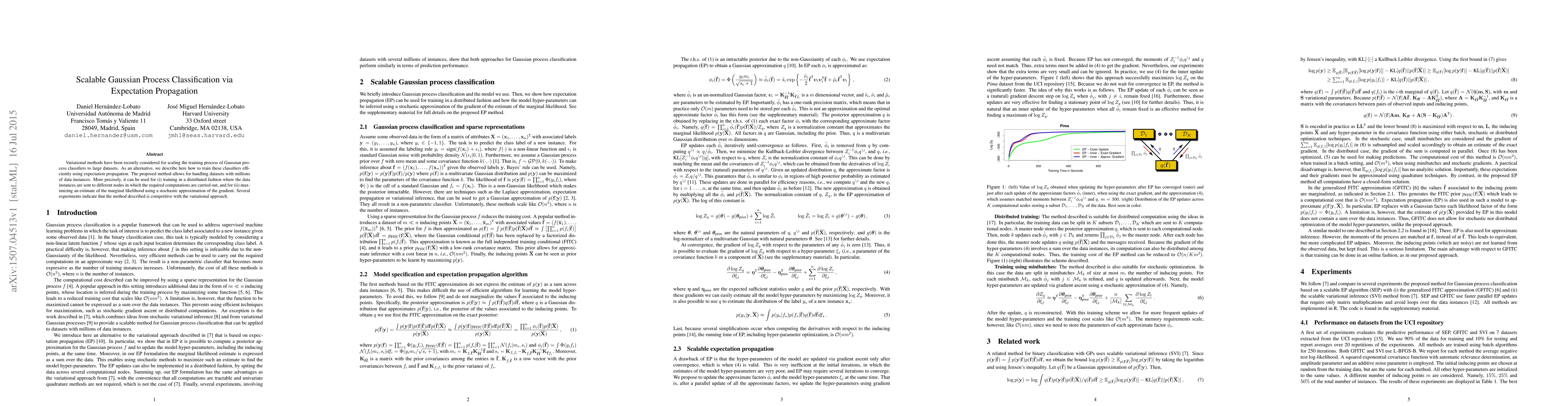 This paper proposes an efficient expectation propagation method for scalable Gaussian process classification, enabling training on large datasets with millions of instances. The method supports distributed training and stochastic gradient maximization, and experiments show it is competitive with variational approaches.