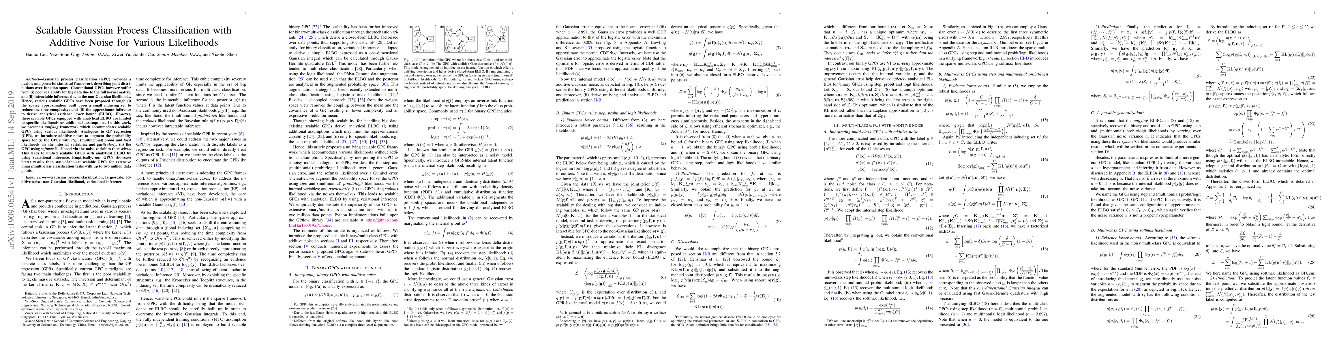 This paper proposes a scalable Gaussian process classification (GPC) framework that accommodates various likelihoods through additive noise techniques. It introduces a unifying approach using variational inference to achieve scalable GPCs with analytical evidence lower bounds, outperforming state-of-the-art methods on large-scale binary and multi-class classification tasks.