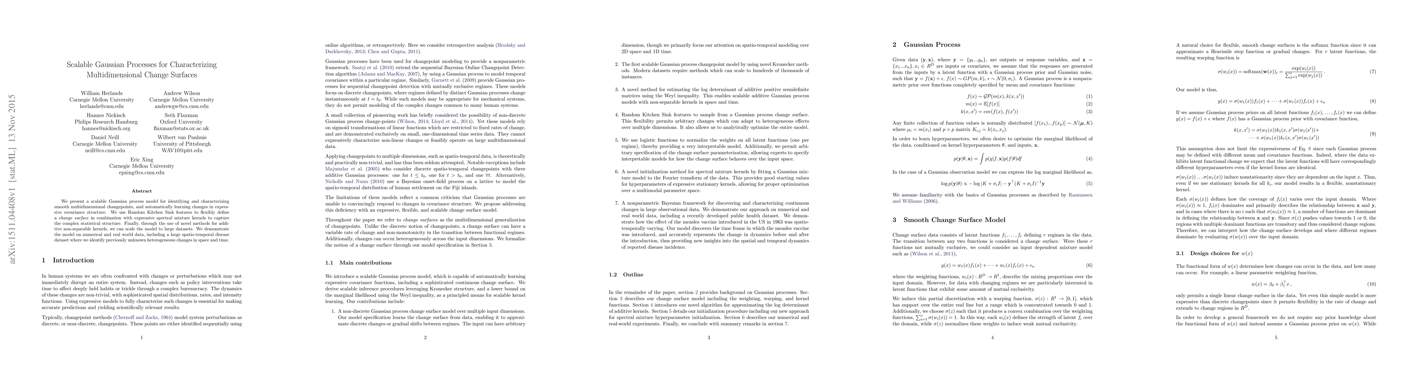 We present a scalable Gaussian process model for identifying and characterizing smooth multidimensional changepoints, and automatically learning changes in expressive covariance structure. We use Random Kitchen Sink features to flexibly define a change surface in combination with expressive spectral mixture kernels to capture the complex statistical structure. Finally, through the use of novel methods for additive non-separable kernels, we can scale the model to large datasets. We demonstrate the model on numerical and real world data, including a large spatio-temporal disease dataset where we identify previously unknown heterogeneous changes in space and time.