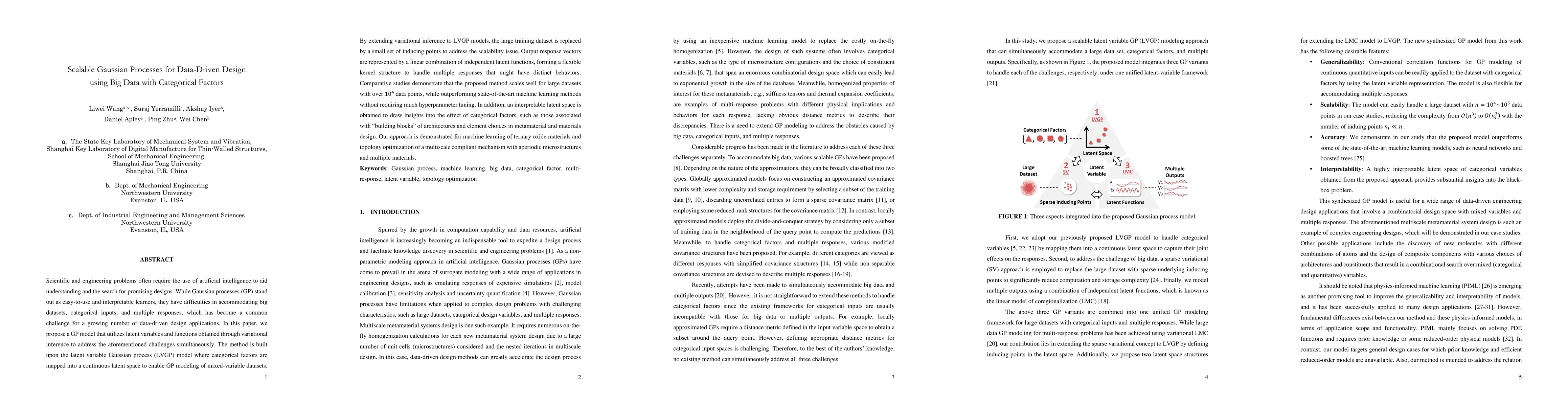 This paper proposes a scalable Gaussian process model using latent variables and variational inference to handle big datasets with categorical factors and multiple responses. The method leverages inducing points to maintain scalability and interpretability, demonstrating effectiveness in material design and topology optimization.