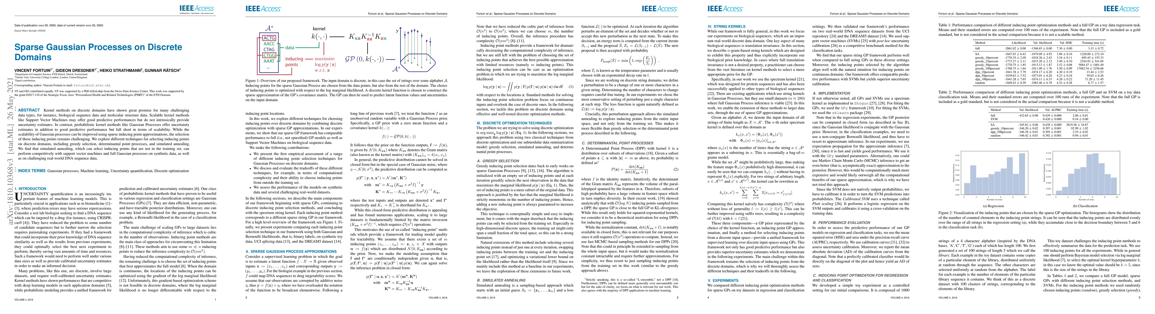 Kernel methods on discrete domains have shown great promise for many challenging data types, for instance, biological sequence data and molecular structure data. Scalable kernel methods like Support Vector Machines may offer good predictive performances but do not intrinsically provide uncertainty estimates. In contrast, probabilistic kernel methods like Gaussian Processes offer uncertainty estimates in addition to good predictive performance but fall short in terms of scalability. While the scalability of Gaussian processes can be improved using sparse inducing point approximations, the selection of these inducing points remains challenging. We explore different techniques for selecting inducing points on discrete domains, including greedy selection, determinantal point processes, and simulated annealing. We find that simulated annealing, which can select inducing points that are not in the training set, can perform competitively with support vector machines and full Gaussian processes on synthetic data, as well as on challenging real-world DNA sequence data.