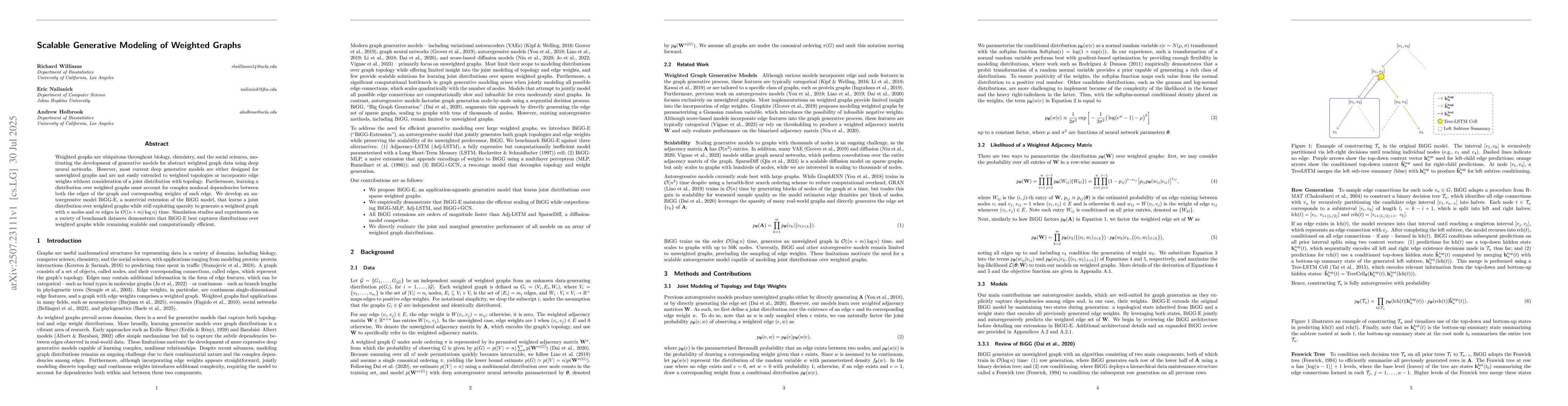 Weighted graphs are ubiquitous throughout biology, chemistry, and the social sciences, motivating the development of generative models for abstract weighted graph data using deep neural networks. However, most current deep generative models are either designed for unweighted graphs and are not easily extended to weighted topologies or incorporate edge weights without consideration of a joint distribution with topology. Furthermore, learning a distribution over weighted graphs must account for complex nonlocal dependencies between both the edges of the graph and corresponding weights of each edge. We develop an autoregressive model BiGG-E, a nontrivial extension of the BiGG model, that learns a joint distribution over weighted graphs while still exploiting sparsity to generate a weighted graph with $n$ nodes and $m$ edges in $O((n + m)\log n)$ time. Simulation studies and experiments on a variety of benchmark datasets demonstrate that BiGG-E best captures distributions over weighted graphs while remaining scalable and computationally efficient.