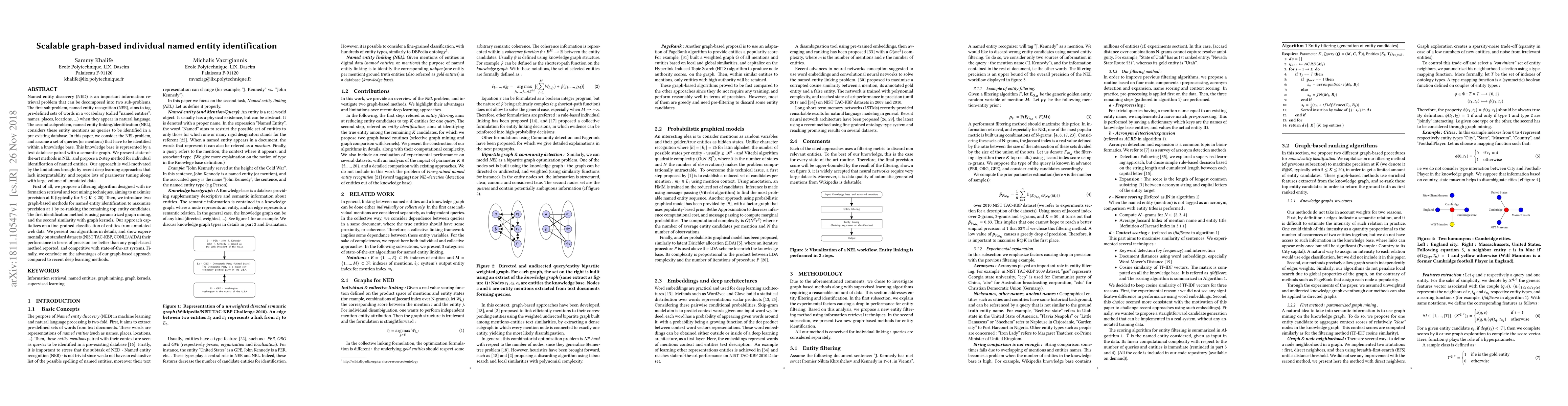 Named entity discovery (NED) is an important information retrieval problem that can be decomposed into two sub-problems. The first sub-problem, named entity recognition (NER), aims to tag pre-defined sets of words in a vocabulary (called "named entities": names, places, locations, ...) when they appear in natural language. The second subproblem, named entity linking/identification (NEL), considers these entity mentions as queries to be identified in a pre-existing database. In this paper, we consider the NEL problem, and assume a set of queries (or mentions) that have to be identified within a knowledge base. This knowledge base is represented by a text database paired with a semantic graph. We present state-of-the-art methods in NEL, and propose a 2-step method for individual identification of named entities. Our approach is well-motivated by the limitations brought by recent deep learning approaches that lack interpratability, and require lots of parameter tuning along with large volume of annotated data. First of all, we propose a filtering algorithm designed with information retrieval and text mining techniques, aiming to maximize precision at K (typically for 5 <= K <=20). Then, we introduce two graph-based methods for named entity identification to maximize precision at 1 by re-ranking the remaining top entity candidates. The first identification method is using parametrized graph mining, and the second similarity with graph kernels. Our approach capitalizes on a fine-grained classification of entities from annotated web data. We present our algorithms in details, and show experimentally on standard datasets (NIST TAC-KBP, CONLL/AIDA) their performance in terms of precision are better than any graph-based method reported, and competitive with state-of-the-art systems. Finally, we conclude on the advantages of our graph-based approach compared to recent deep learning methods.