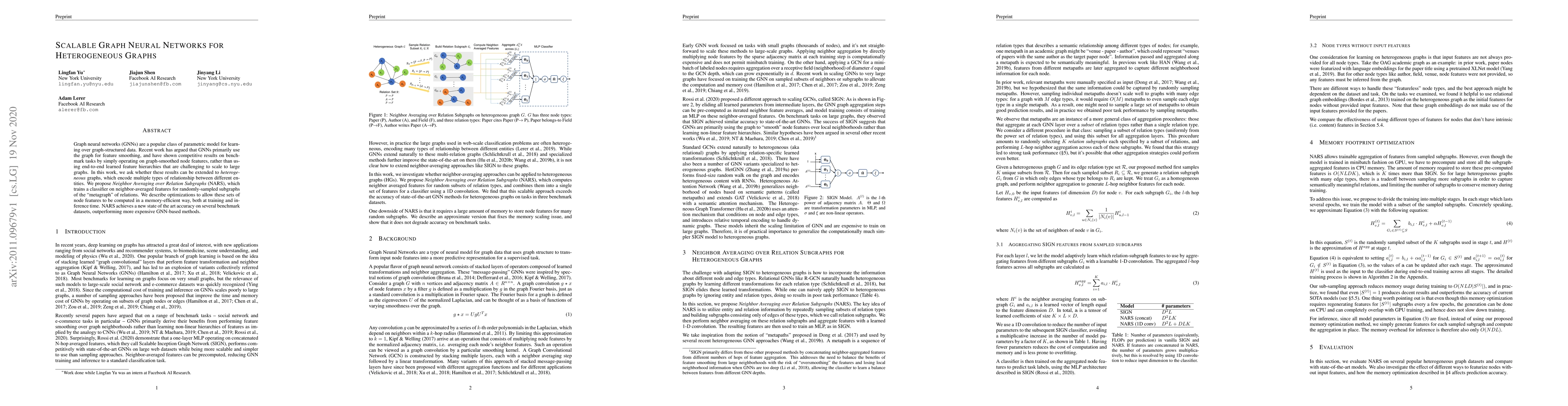 Graph neural networks (GNNs) are a popular class of parametric model for learning over graph-structured data. Recent work has argued that GNNs primarily use the graph for feature smoothing, and have shown competitive results on benchmark tasks by simply operating on graph-smoothed node features, rather than using end-to-end learned feature hierarchies that are challenging to scale to large graphs. In this work, we ask whether these results can be extended to heterogeneous graphs, which encode multiple types of relationship between different entities. We propose Neighbor Averaging over Relation Subgraphs (NARS), which trains a classifier on neighbor-averaged features for randomly-sampled subgraphs of the "metagraph" of relations. We describe optimizations to allow these sets of node features to be computed in a memory-efficient way, both at training and inference time. NARS achieves a new state of the art accuracy on several benchmark datasets, outperforming more expensive GNN-based methods