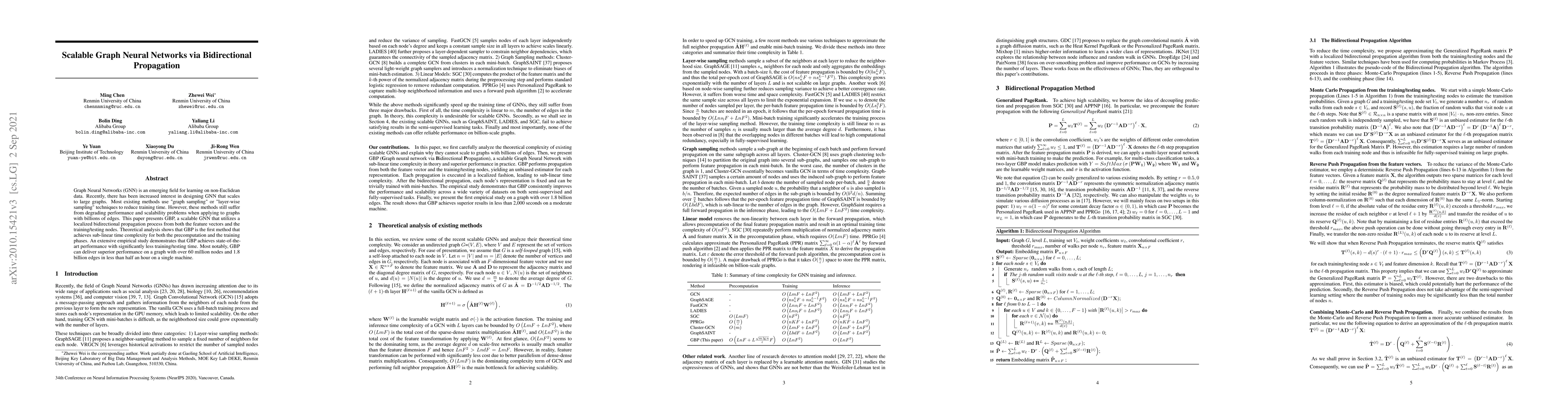 This paper presents GBP, a scalable GNN based on localized bidirectional propagation. It utilizes a Generalized Page Rank matrix computed via a bidirectional propagation process from both feature vectors and training/testing nodes.