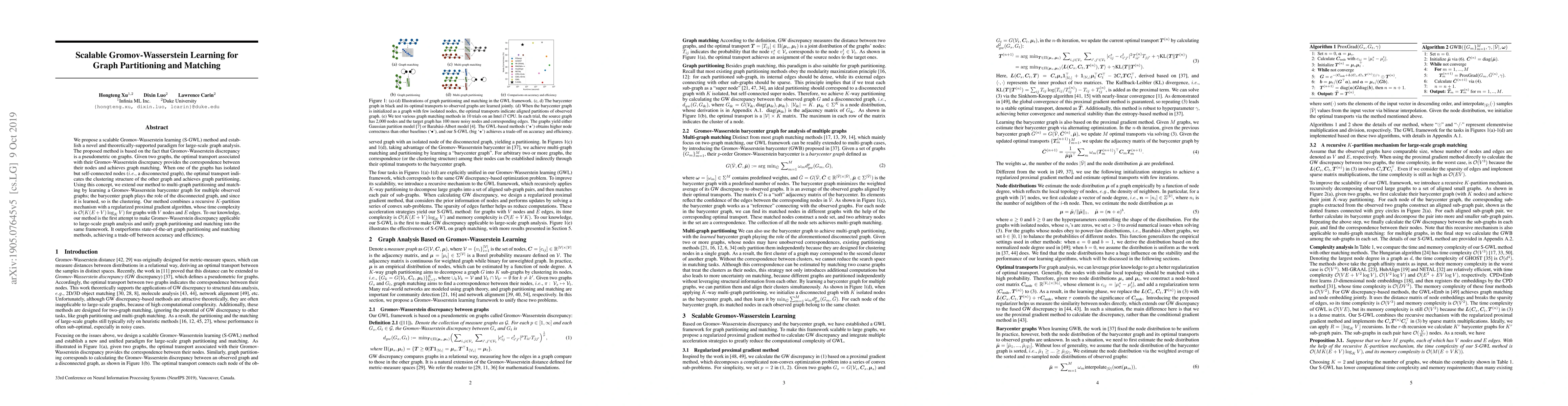 This paper proposes a scalable Gromov-Wasserstein learning (S-GWL) method for large-scale graph analysis, unifying graph partitioning and matching. The method leverages the Gromov-Wasserstein discrepancy to achieve optimal transport for graph correspondence, clustering, and partitioning.