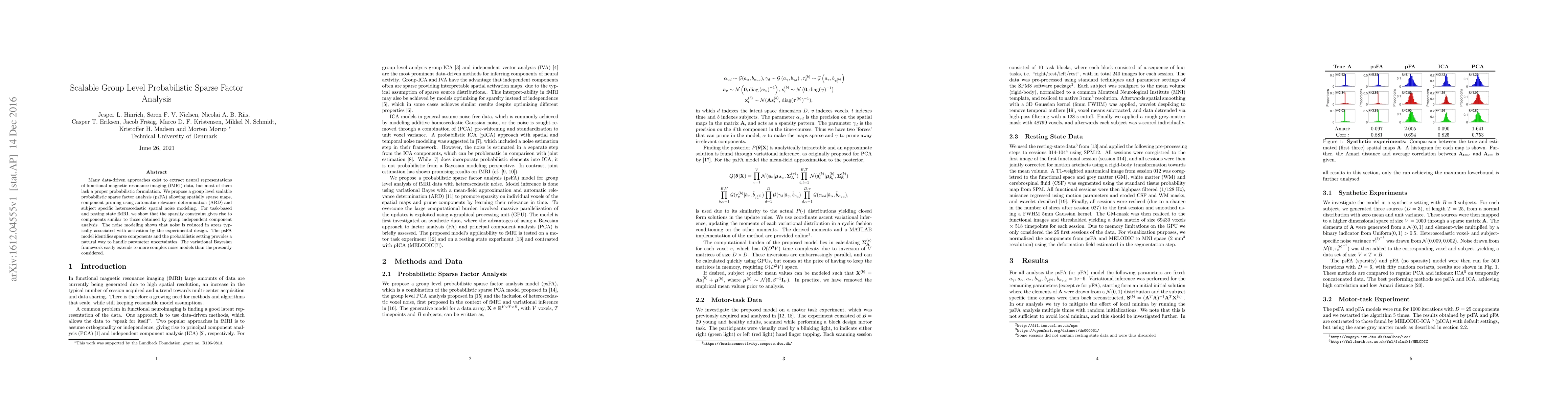 Many data-driven approaches exist to extract neural representations of functional magnetic resonance imaging (fMRI) data, but most of them lack a proper probabilistic formulation. We propose a group level scalable probabilistic sparse factor analysis (psFA) allowing spatially sparse maps, component pruning using automatic relevance determination (ARD) and subject specific heteroscedastic spatial noise modeling. For task-based and resting state fMRI, we show that the sparsity constraint gives rise to components similar to those obtained by group independent component analysis. The noise modeling shows that noise is reduced in areas typically associated with activation by the experimental design. The psFA model identifies sparse components and the probabilistic setting provides a natural way to handle parameter uncertainties. The variational Bayesian framework easily extends to more complex noise models than the presently considered.