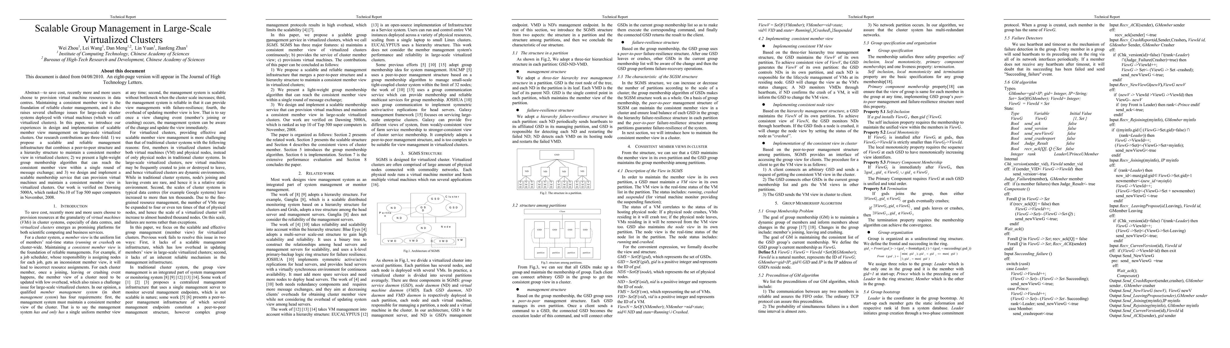 To save cost, recently more and more users choose to provision virtual machine resources in cluster systems, especially in data centres. Maintaining a consistent member view is the foundation of reliable cluster managements, and it also raises several challenge issues for large scale cluster systems deployed with virtual machines (which we call virtualized clusters). In this paper, we introduce our experiences in design and implementation of scalable member view management on large-scale virtual clusters. Our research contributions are three-fold: 1) we propose a scalable and reliable management infrastructure that combines a peer-to-peer structure and a hierarchy structure to maintain a consistent member view in virtual clusters; 2) we present a light-weighted group membership algorithm that can reach the consistent member view within a single round of message exchange; and 3) we design and implement a scalable membership service that can provision virtual machines and maintain a consistent member view in virtual clusters. Our work is verified on Dawning 5000A, which ranked No.10 of Top 500 super computers in November, 2008.
