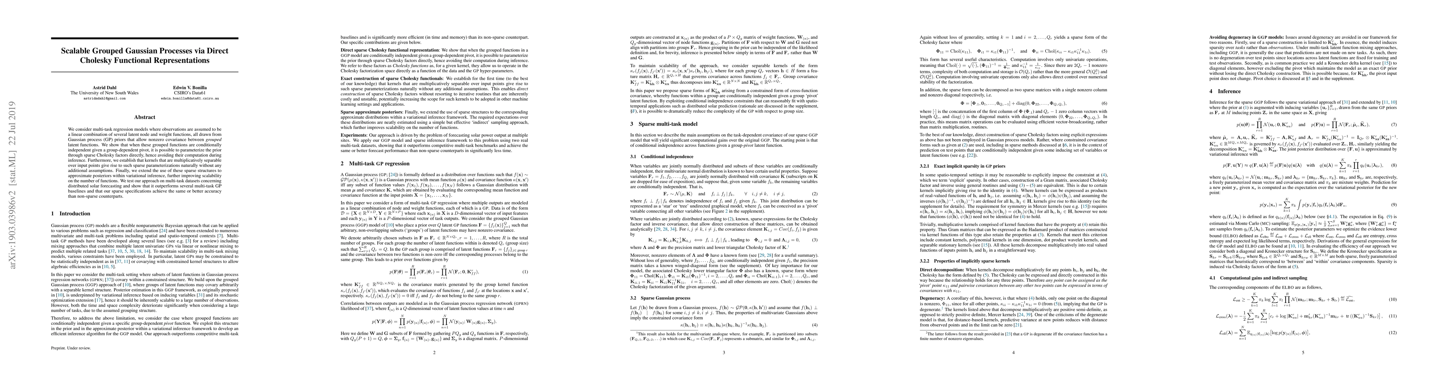 We consider multi-task regression models where observations are assumed to be a linear combination of several latent node and weight functions, all drawn from Gaussian process (GP) priors that allow nonzero covariance between grouped latent functions. We show that when these grouped functions are conditionally independent given a group-dependent pivot, it is possible to parameterize the prior through sparse Cholesky factors directly, hence avoiding their computation during inference. Furthermore, we establish that kernels that are multiplicatively separable over input points give rise to such sparse parameterizations naturally without any additional assumptions. Finally, we extend the use of these sparse structures to approximate posteriors within variational inference, further improving scalability on the number of functions. We test our approach on multi-task datasets concerning distributed solar forecasting and show that it outperforms several multi-task GP baselines and that our sparse specifications achieve the same or better accuracy than non-sparse counterparts.