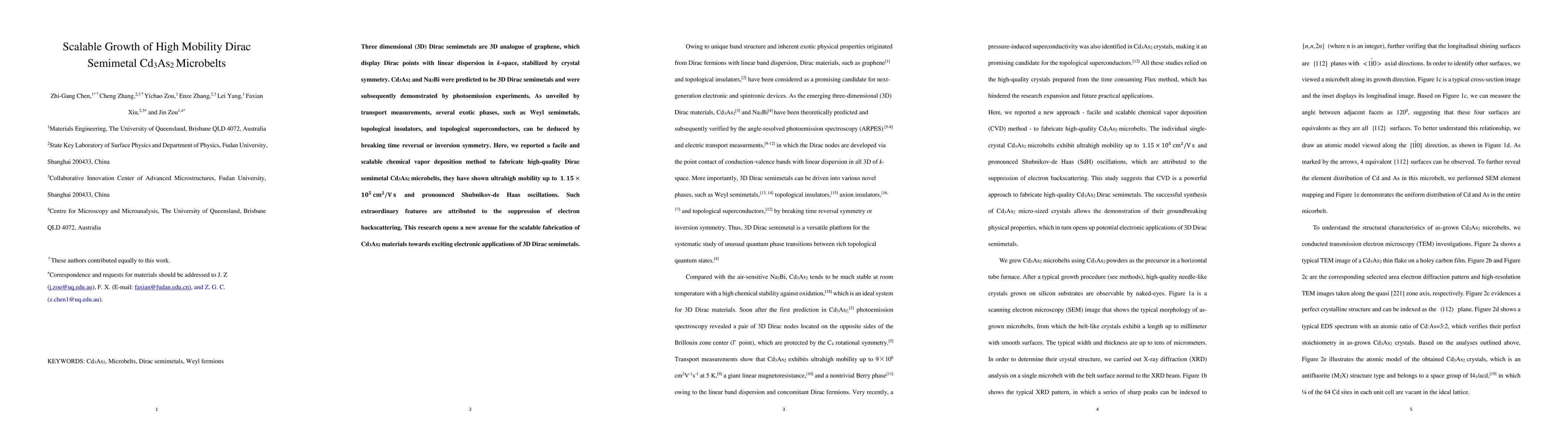 This paper reports a scalable chemical vapor deposition method for fabricating high-quality Cd3As2 microbelts, demonstrating ultrahigh electron mobility and Shubnikov-de Haas oscillations, attributed to suppressed electron backscattering, thus opening pathways for 3D Dirac semimetal applications.